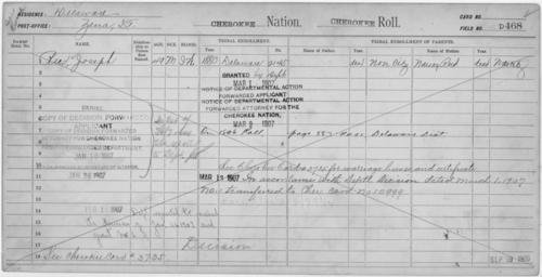 | Keywords: Enrollment for Cherokee Census Card D468 - NARA - 252216.jpg Scope and content Name Joseph Reed Type Doubtful Age 49 Sex Male Degree Indian Blood IW Roll Number Not Reported Post Office Zena Name Nancy Reed Type Parent Age Not Reported Sex Female Degree Indian Blood Not Reported Roll Number Not Reported Post Office Not Reported General notes 252216 Local identifier 75-53A-CHEROKEE D468 Department of the Interior Office of Indian Affairs Office of the Commissioner to the Five Civilized Tribes 1893 - 1914 NARA's Southwest Region Fort Worth NRFA 1400 John Burgess Drive Fort Worth TX 76140 Record group Record Group 75 Records of the Bureau of Indian Affairs 1793 - 1999 Record group ARC 404 Enrollment Cards compiled 1898 - 1914 Series ARC 251747 File unit File unit ARC Variant control numbers NAIL Control Number NRFF-75-53A-53713<br /> NAIL Control Number NRFF-75-53A-53714<br /> NAIL Control Number NRFF-75-53A-CHEROKEE D468 Other versions <gallery> File Enrollment_for_Cherokee_Census_Card_D468_-_NARA_-_252216 tif tif File Enrollment_for_Cherokee_Census_Card_D468_-_NARA_-_252216 jpg jpg </gallery> NARA-cooperation PD-USGov Cherokee census cards |