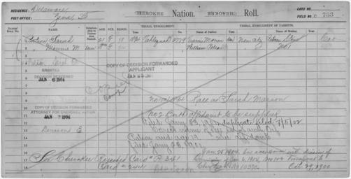 | Keywords: Enrollment for Cherokee Census Card D733 - NARA - 252481.jpg Scope and content Name Sarah Pation Type Doubtful Age 21 Sex Female Degree Indian Blood 1/8 Roll Number Not Reported Post Office Zena Name Minnie M Pation Type Doubtful Age 2 Sex Female Degree Indian Blood 1/16 Roll Number Not Reported Post Office Zena Name Francis Marion Type Parent Age Not Reported Sex Male Degree Indian Blood Not Reported Roll Number Not Reported Post Office Not Reported Name William Pation Type Parent Age Not Reported Sex Male Degree Indian Blood Not Reported Roll Number Not Reported Post Office Not Reported Name Rebecca Stone Type Parent Age Not Reported Sex Female Degree Indian Blood Not Reported Roll Number Not Reported Post Office Not Reported General notes 252481 Local identifier 75-53A-CHEROKEE D733 Department of the Interior Office of Indian Affairs Office of the Commissioner to the Five Civilized Tribes 1893 - 1914 NARA's Southwest Region Fort Worth NRFA 1400 John Burgess Drive Fort Worth TX 76140 Record group Record Group 75 Records of the Bureau of Indian Affairs 1793 - 1999 Record group ARC 404 Enrollment Cards compiled 1898 - 1914 Series ARC 251747 File unit File unit ARC Variant control numbers NAIL Control Number NRFF-75-53A-55028<br /> NAIL Control Number NRFF-75-53A-55029<br /> NAIL Control Number NRFF-75-53A-55030<br /> NAIL Control Number NRFF-75-53A-55031<br /> NAIL Control Number NRFF-75-53A-55032<br /> NAIL Control Number NRFF-75-53A-CHEROKEE D733 Other versions <gallery> File Enrollment_for_Cherokee_Census_Card_D733_-_NARA_-_252481 tif tif File Enrollment_for_Cherokee_Census_Card_D733_-_NARA_-_252481 jpg jpg </gallery> NARA-cooperation PD-USGov Cherokee census cards |