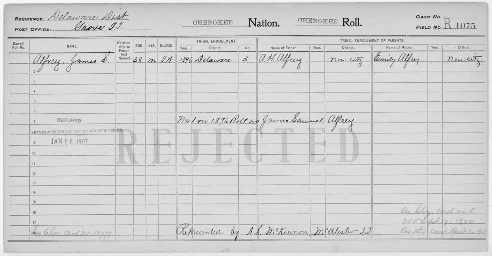| Keywords: Enrollment for Cherokee Census Card R1075 - NARA - 260138.jpg  Scope and content Name A H Alfrey Type Parent Sex Male Name Emily Alfrey Type Parent Sex Female Name James S Alfrey Type Rejected Age 38 Sex Male Degree Indian Blood Intermarried White City of Residence Grove General notes 260138 Local identifier 75-53A-CHEROKEE R1075 Department of the Interior Office of Indian Affairs Office of the Commissioner to the Five Civilized Tribes 1893 - 1914 NARA's Southwest Region Fort Worth NRFA 1400 John Burgess Drive Fort Worth TX 76140 Record group Record Group 75 Records of the Bureau of Indian Affairs 1793 - 1999 Record group ARC 404 Enrollment Cards compiled 1898 - 1914 Series ARC 251747 File unit File unit ARC Variant control numbers NAIL Control Number NRFF-75-53A-363<br /> NAIL Control Number NRFF-75-53A-364<br /> NAIL Control Number NRFF-75-53A-367<br /> NAIL Control Number NRFF-75-53A-CHEROKEE R1075 Other versions <gallery> File Enrollment_for_Cherokee_Census_Card_R1075_-_NARA_-_260138 tif tif File Enrollment_for_Cherokee_Census_Card_R1075_-_NARA_-_260138 jpg jpg </gallery> NARA-cooperation PD-USGov Cherokee census cards |