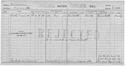 | Keywords: Enrollment for Cherokee Census Card R1159 - NARA - 260222.jpg Scope and content Name Alex Boothe Type Parent Sex Male Name Francis M Boothe Type Rejected Age 36 Sex Male Degree Indian Blood Intermarried White City of Residence Wagoner ok Name Sarina Boothe Type Parent Sex Female General notes 260222 Local identifier 75-53A-CHEROKEE R1159 Department of the Interior Office of Indian Affairs Office of the Commissioner to the Five Civilized Tribes 1893 - 1914 NARA's Southwest Region Fort Worth NRFA 1400 John Burgess Drive Fort Worth TX 76140 Record group Record Group 75 Records of the Bureau of Indian Affairs 1793 - 1999 Record group ARC 404 Enrollment Cards compiled 1898 - 1914 Series ARC 251747 File unit File unit ARC Variant control numbers NAIL Control Number NRFF-75-53A-2056<br /> NAIL Control Number NRFF-75-53A-2057<br /> NAIL Control Number NRFF-75-53A-2058<br /> NAIL Control Number NRFF-75-53A-CHEROKEE R1159 Other versions <gallery> File Enrollment_for_Cherokee_Census_Card_R1159_-_NARA_-_260222 tif tif File Enrollment_for_Cherokee_Census_Card_R1159_-_NARA_-_260222 jpg jpg </gallery> NARA-cooperation PD-USGov Cherokee census cards |
