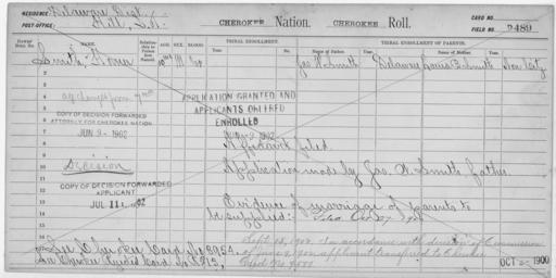 | Keywords: Enrollment for Cherokee Census Card D489 - NARA - 252237.tif Local identifier 75-53A-CHEROKEE D489 Department of the Interior Office of Indian Affairs Office of the Commissioner to the Five Civilized Tribes 1893 - 1914 NARA's Southwest Region Fort Worth NRFA 1400 John Burgess Drive Fort Worth TX 76140 Record group Record Group 75 Records of the Bureau of Indian Affairs 1793 - 1999 Record group ARC 404 Enrollment Cards compiled 1898 - 1914 Series ARC 251747 Variant control numbers NAIL Control Number NRFF-75-53A-53839<br /> NAIL Control Number NRFF-75-53A-53840<br /> NAIL Control Number NRFF-75-53A-53841<br /> NAIL Control Number NRFF-75-53A-CHEROKEE D489 General notes Scope and content Name Homer Smith Type Doubtful Age 1 Sex Male Degree Indian Blood 1/32 Roll Number Not Reported Post Office Hill Name J W Smith Type Parent Age Not Reported Sex Male Degree Indian Blood Not Reported Roll Number Not Reported Post Office Not Reported Name Laura B Smith Type Parent Age Not Reported Sex Female Degree Indian Blood Not Reported Roll Number Not Reported Post Office Not Reported File unit File unit ARC yes <gallery> File Enrollment_for_Cherokee_Census_Card_D489_-_NARA_-_252237 tif tif File Enrollment_for_Cherokee_Census_Card_D489_-_NARA_-_252237 jpg jpg </gallery> NARA-cooperation PD-USGov Cherokee census cards NARA TIF images with categorized JPGs |