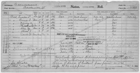| Keywords: Enrollment for Cherokee Census Card D572 - NARA - 252320.tif Local identifier 75-53A-CHEROKEE D572 Department of the Interior Office of Indian Affairs Office of the Commissioner to the Five Civilized Tribes 1893 - 1914 NARA's Southwest Region Fort Worth NRFA 1400 John Burgess Drive Fort Worth TX 76140 Record group Record Group 75 Records of the Bureau of Indian Affairs 1793 - 1999 Record group ARC 404 Enrollment Cards compiled 1898 - 1914 Series ARC 251747 Variant control numbers NAIL Control Number NRFF-75-53A-54252<br /> NAIL Control Number NRFF-75-53A-54253<br /> NAIL Control Number NRFF-75-53A-54254<br /> NAIL Control Number NRFF-75-53A-54255<br /> NAIL Control Number NRFF-75-53A-54256<br /> NAIL Control Number NRFF-75-53A-54257<br /> NAIL Control Number NRFF-75-53A-54258<br /> NAIL Control Number NRFF-75-53A-54259<br /> NAIL Control Number NRFF-75-53A-54260<br /> NAIL Control Number NRFF-75-53A-54261<br /> NAIL Control Number NRFF-75-53A-CHEROKEE D572 General notes Scope and content Name Susan L Reed Type Doubtful Age 33 Sex Female Degree Indian Blood IW Roll Number Not Reported Post Office Bartlesville Name Lerina I Reed Type Doubtful Age 10 Sex Female Degree Indian Blood 1/4 Roll Number Not Reported Post Office Bartlesville Name Nancy A Reed Type Doubtful Age 8 Sex Female Degree Indian Blood 1/4 Roll Number Not Reported Post Office Bartlesville Name Philetus L A Reed Type Doubtful Age 6 Sex Male Degree Indian Blood 1/4 Roll Number Not Reported Post Office Bartlesville Name Ala M Reed Type Doubtful Age 4 Sex Female Degree Indian Blood 1/4 Roll Number Not Reported Post Office Bartlesville Name Alice L V Reed Type Doubtful Age 2 Sex Female Degree Indian Blood 1/4 Roll Number Not Reported Post Office Bartlesville Name David A Reed Type Doubtful Age 1 Sex Male Degree Indian Blood 1/4 Roll Number Not Reported Post Office Bartlesville Name Andrew Reed Type Parent Age Not Reported Sex Male Degree Indian Blood Not Reported Roll Number Not Reported Post Office Not Reported Name Matt Lucas Type Parent Age Not Reported Sex Male Degree Indian Blood Not Reported Roll Number Not Reported Post Office Not Reported Name Martha Lucas Type Parent Age Not Reported Sex Female Degree Indian Blood Not Reported Roll Number Not Reported Post Office Not Reported File unit File unit ARC yes <gallery> File Enrollment_for_Cherokee_Census_Card_D572_-_NARA_-_252320 tif tif File Enrollment_for_Cherokee_Census_Card_D572_-_NARA_-_252320 jpg jpg </gallery> NARA-cooperation PD-USGov Cherokee census cards NARA TIF images with categorized JPGs |