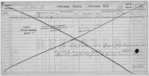 | Keywords: Enrollment for Cherokee Census Card R75 - NARA - 259138.tif Scope and content Name Charles L Fool Type Rejected Age 4 Sex Male Degree Indian Blood 1/2 City of Residence Starvilla Name Jack Fool Type Parent Sex Male Name Lina B Weaver Type Parent Sex Female General notes 259138 Local identifier 75-53A-CHEROKEE R75 Department of the Interior Office of Indian Affairs Office of the Commissioner to the Five Civilized Tribes 1893 - 1914 NARA's Southwest Region Fort Worth NRFA 1400 John Burgess Drive Fort Worth TX 76140 Record group Record Group 75 Records of the Bureau of Indian Affairs 1793 - 1999 Record group ARC 404 Enrollment Cards compiled 1898 - 1914 Series ARC 251747 File unit File unit ARC Variant control numbers NAIL Control Number NRFF-75-53A-20980<br /> NAIL Control Number NRFF-75-53A-6654<br /> NAIL Control Number NRFF-75-53A-6655<br /> NAIL Control Number NRFF-75-53A-CHEROKEE R75 yes Other versions <gallery> File Enrollment_for_Cherokee_Census_Card_R75_-_NARA_-_259138 tif tif File Enrollment_for_Cherokee_Census_Card_R75_-_NARA_-_259138 jpg jpg </gallery> NARA-cooperation PD-USGov Cherokee census cards NARA TIF images with categorized JPGs |