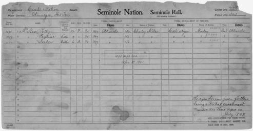| Keywords: Enrollment for Seminole Census Card 323 - NARA - 267897.tif Scope and content Name Charley McNac Type Parent Sex Male City of Residence Creek Name Pauline McNac Type By Blood Age 9 Sex Female Degree Indian Blood 1/2 Roll Number 1099 City of Residence o Name Polly McNac Type By Blood Age 12 Sex Female Degree Indian Blood 1/2 Roll Number 1098 City of Residence o Name Seeker McNac Type By Blood Age 6 Sex Male Degree Indian Blood 1/2 Roll Number 1100 City of Residence o Name Minkey Type Parent Sex Female City of Residence o General notes 267897 Local identifier 75-53A-SEMINOLE 323 Department of the Interior Office of Indian Affairs Office of the Commissioner to the Five Civilized Tribes 1893 - 1914 NARA's Southwest Region Fort Worth NRFA 1400 John Burgess Drive Fort Worth TX 76140 Record group Record Group 75 Records of the Bureau of Indian Affairs 1793 - 1999 Record group ARC 404 Enrollment Cards compiled 1898 - 1914 Series ARC 251747 File unit File unit ARC Variant control numbers NAIL Control Number NRFF-75-53A-41582<br /> NAIL Control Number NRFF-75-53A-41619<br /> NAIL Control Number NRFF-75-53A-41624<br /> NAIL Control Number NRFF-75-53A-41629<br /> NAIL Control Number NRFF-75-53A-42230<br /> NAIL Control Number NRFF-75-53A-SEMINOLE 323 yes Other versions <gallery> File Enrollment_for_Seminole_Census_Card_323_-_NARA_-_267897 tif tif File Enrollment_for_Seminole_Census_Card_323_-_NARA_-_267897 jpg jpg </gallery> NARA-cooperation PD-USGov Seminole census cards NARA TIF images with categorized JPGs |