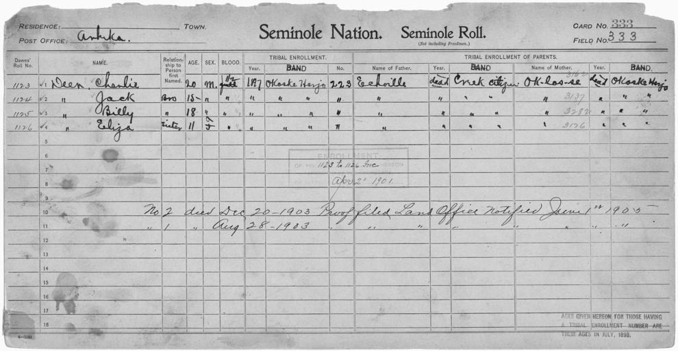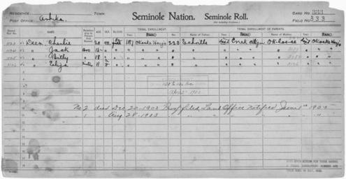 | Keywords: Enrollment for Seminole Census Card 333 - NARA - 267907.jpg Scope and content Name Billy Deer Type By Blood Age 18 Sex Male Degree Indian Blood 1/2 Roll Number 1125 City of Residence oh Name Charlie Deer Type By Blood Age 20 Sex Male Degree Indian Blood 1/2 Roll Number 1123 City of Residence oh Name Eliza Deer Type By Blood Age 11 Sex Female Degree Indian Blood 1/2 Roll Number 1126 City of Residence oh Name Jack Deer Type By Blood Age 15 Sex Male Degree Indian Blood 1/2 Roll Number 1124 City of Residence oh Name Echoille Type Parent Sex Male City of Residence Creek Name Oklasse Type Parent Sex Female City of Residence oh General notes 267907 Local identifier 75-53A-SEMINOLE 333 Department of the Interior Office of Indian Affairs Office of the Commissioner to the Five Civilized Tribes 1893 - 1914 NARA's Southwest Region Fort Worth NRFA 1400 John Burgess Drive Fort Worth TX 76140 Record group Record Group 75 Records of the Bureau of Indian Affairs 1793 - 1999 Record group ARC 404 Enrollment Cards compiled 1898 - 1914 Series ARC 251747 File unit File unit ARC Variant control numbers NAIL Control Number NRFF-75-53A-30065<br /> NAIL Control Number NRFF-75-53A-30069<br /> NAIL Control Number NRFF-75-53A-30081<br /> NAIL Control Number NRFF-75-53A-30095<br /> NAIL Control Number NRFF-75-53A-30762<br /> NAIL Control Number NRFF-75-53A-43392<br /> NAIL Control Number NRFF-75-53A-SEMINOLE 333 Other versions <gallery> File Enrollment_for_Seminole_Census_Card_333_-_NARA_-_267907 tif tif File Enrollment_for_Seminole_Census_Card_333_-_NARA_-_267907 jpg jpg </gallery> NARA-cooperation PD-USGov Seminole census cards |