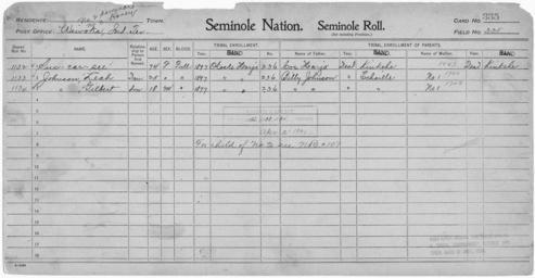 | Keywords: Enrollment for Seminole Census Card 335 - NARA - 267909.tif Scope and content Name Coe Harjo Type Parent Sex Male City of Residence k Name Billy Johnson Type Parent Sex Male City of Residence e Name Gilbert Johnson Type By Blood Age 18 Sex Male Degree Indian Blood Full Roll Number 1134 City of Residence oh Name Leah Johnson Type By Blood Age 25 Sex Female Degree Indian Blood Full Roll Number 1133 City of Residence oh Name Succarsee Type By Blood Age 74 Sex Female Degree Indian Blood Full Roll Number 1132 City of Residence oh General notes 267909 Local identifier 75-53A-SEMINOLE 335 Department of the Interior Office of Indian Affairs Office of the Commissioner to the Five Civilized Tribes 1893 - 1914 NARA's Southwest Region Fort Worth NRFA 1400 John Burgess Drive Fort Worth TX 76140 Record group Record Group 75 Records of the Bureau of Indian Affairs 1793 - 1999 Record group ARC 404 Enrollment Cards compiled 1898 - 1914 Series ARC 251747 File unit File unit ARC Variant control numbers NAIL Control Number NRFF-75-53A-34222<br /> NAIL Control Number NRFF-75-53A-37732<br /> NAIL Control Number NRFF-75-53A-37817<br /> NAIL Control Number NRFF-75-53A-37867<br /> NAIL Control Number NRFF-75-53A-48165<br /> NAIL Control Number NRFF-75-53A-SEMINOLE 335 yes Other versions <gallery> File Enrollment_for_Seminole_Census_Card_335_-_NARA_-_267909 tif tif File Enrollment_for_Seminole_Census_Card_335_-_NARA_-_267909 jpg jpg </gallery> NARA-cooperation PD-USGov Seminole census cards NARA TIF images with categorized JPGs |