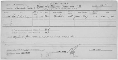 | Keywords: Enrollment for Seminole Census Card 101 - NARA - 267675.tif Scope and content Name Flora Fish Type By Blood Age 21 Sex Female Degree Indian Blood Full Roll Number 355 City of Residence tp Name Joanna Fish Type By Blood Age 1 Sex Female Degree Indian Blood Full Roll Number 356 City of Residence tp Name Milly Fish Type By Blood Age 42 Sex Female Degree Indian Blood Full Roll Number 351 City of Residence tp Name Konihikey Type Parent Sex Female City of Residence tp Name Jo Riley Type Parent Sex Male City of Residence nh Name Fanny Wolf Type By Blood Age 10 Sex Female Degree Indian Blood Full Roll Number 354 City of Residence tp Name Robert Wolf Type Parent Sex Male City of Residence e Name Amey Yahola Type By Blood Age 20 Sex Female Degree Indian Blood Full Roll Number 352 City of Residence tp Name Eliza Yahola Type By Blood Age 15 Sex Female Degree Indian Blood Full Roll Number 353 City of Residence tp Name Yakti Yahola Type Parent Sex Male City of Residence e Name Simon War Le Do Type Newborn Age 3 Sex Male Degree Indian Blood FULL Roll Number 128 Post Office Keokuk Falls General notes 267675 Local identifier 75-53A-SEMINOLE 101 Department of the Interior Office of Indian Affairs Office of the Commissioner to the Five Civilized Tribes 1893 - 1914 NARA's Southwest Region Fort Worth NRFA 1400 John Burgess Drive Fort Worth TX 76140 Record group Record Group 75 Records of the Bureau of Indian Affairs 1793 - 1999 Record group ARC 404 Enrollment Cards compiled 1898 - 1914 Series ARC 251747 File unit File unit ARC Variant control numbers NAIL Control Number NRFF-75-53A-31612<br /> NAIL Control Number NRFF-75-53A-31632<br /> NAIL Control Number NRFF-75-53A-31652<br /> NAIL Control Number NRFF-75-53A-38897<br /> NAIL Control Number NRFF-75-53A-45099<br /> NAIL Control Number NRFF-75-53A-51827<br /> NAIL Control Number NRFF-75-53A-51884<br /> NAIL Control Number NRFF-75-53A-52049<br /> NAIL Control Number NRFF-75-53A-52118<br /> NAIL Control Number NRFF-75-53A-52307<br /> NAIL Control Number NRFF-75-53A-52670<br /> NAIL Control Number NRFF-75-53A-SEMINOLE 101 yes Other versions <gallery> File Enrollment_for_Seminole_Census_Card_101_-_NARA_-_267675 tif tif File Enrollment_for_Seminole_Census_Card_101_-_NARA_-_267675 jpg jpg </gallery> NARA-cooperation PD-USGov Cherokee census cards NARA TIF images with categorized JPGs |