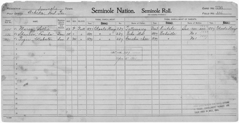 | Keywords: Enrollment for Seminole Census Card 336 - NARA - 267910.jpg Scope and content Name Carchuchee Type Parent Sex Male City of Residence e Name Echoilla Type Parent Sex Male City of Residence e Name Sallie Marcy Type By Blood Age 43 Sex Female Degree Indian Blood Full Roll Number 1135 City of Residence oh Name Lowila Spencer Type By Blood Age 14 Sex Female Degree Indian Blood Full Roll Number 1136 City of Residence oh Name Succarsee Type Parent Sex Female City of Residence oh Name Tallemarcy Type Parent Sex Male City of Residence k Name Webster Tiger Type By Blood Age 8 Sex Male Degree Indian Blood Full Roll Number 1137 City of Residence oh General notes 267910 Local identifier 75-53A-SEMINOLE 336 Department of the Interior Office of Indian Affairs Office of the Commissioner to the Five Civilized Tribes 1893 - 1914 NARA's Southwest Region Fort Worth NRFA 1400 John Burgess Drive Fort Worth TX 76140 Record group Record Group 75 Records of the Bureau of Indian Affairs 1793 - 1999 Record group ARC 404 Enrollment Cards compiled 1898 - 1914 Series ARC 251747 File unit File unit ARC Variant control numbers NAIL Control Number NRFF-75-53A-27122<br /> NAIL Control Number NRFF-75-53A-30761<br /> NAIL Control Number NRFF-75-53A-40483<br /> NAIL Control Number NRFF-75-53A-47738<br /> NAIL Control Number NRFF-75-53A-48166<br /> NAIL Control Number NRFF-75-53A-48527<br /> NAIL Control Number NRFF-75-53A-49841<br /> NAIL Control Number NRFF-75-53A-SEMINOLE 336 Other versions <gallery> File Enrollment_for_Seminole_Census_Card_336_-_NARA_-_267910 tif tif File Enrollment_for_Seminole_Census_Card_336_-_NARA_-_267910 jpg jpg </gallery> NARA-cooperation PD-USGov Seminole census cards |