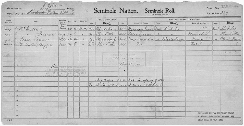 | Keywords: Enrollment for Seminole Census Card 339 - NARA - 267913.tif Scope and content Name Simon Bear Type By Blood Age 12 Sex Male Degree Indian Blood Full Roll Number 1146 City of Residence oh Name Nocas Emarther Type Parent Sex Male City of Residence oh Name Henneo Fixico Type Parent Sex Male City of Residence k Name Nocas Fixico Type Parent Sex Male City of Residence k Name McCulla Type By Blood Age 28 Sex Male Degree Indian Blood Full Roll Number 1144 City of Residence oh Name Maggie McCulla Type By Blood Age 1 Sex Female Degree Indian Blood Full City of Residence tl Name Rosanna McCulla Type By Blood Age 27 Sex Female Degree Indian Blood Full Roll Number 1145 City of Residence tl Name Monacher Type Parent Sex Female City of Residence tl General notes 267913 Local identifier 75-53A-SEMINOLE 339 Department of the Interior Office of Indian Affairs Office of the Commissioner to the Five Civilized Tribes 1893 - 1914 NARA's Southwest Region Fort Worth NRFA 1400 John Burgess Drive Fort Worth TX 76140 Record group Record Group 75 Records of the Bureau of Indian Affairs 1793 - 1999 Record group ARC 404 Enrollment Cards compiled 1898 - 1914 Series ARC 251747 File unit File unit ARC Variant control numbers NAIL Control Number NRFF-75-53A-24317<br /> NAIL Control Number NRFF-75-53A-30876<br /> NAIL Control Number NRFF-75-53A-31907<br /> NAIL Control Number NRFF-75-53A-31997<br /> NAIL Control Number NRFF-75-53A-41005<br /> NAIL Control Number NRFF-75-53A-41008<br /> NAIL Control Number NRFF-75-53A-41011<br /> NAIL Control Number NRFF-75-53A-42399<br /> NAIL Control Number NRFF-75-53A-SEMINOLE 339 yes Other versions <gallery> File Enrollment_for_Seminole_Census_Card_339_-_NARA_-_267913 tif tif File Enrollment_for_Seminole_Census_Card_339_-_NARA_-_267913 jpg jpg </gallery> NARA-cooperation PD-USGov Seminole census cards NARA TIF images with categorized JPGs |