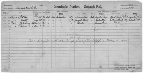 | Keywords: Enrollment for Seminole Census Card 348 - NARA - 267922.jpg Scope and content Name Ellen Buck Type Parent Sex Female City of Residence e Name Joseph Buck Type Parent Sex Male City of Residence e Name Chula Type Parent Sex Male City of Residence sb Name Cotser Ficxico Type By Blood Age 45 Sex Male Degree Indian Blood Full Roll Number 1172 City of Residence e Name Matty Fixico Type By Blood Age 28 Sex Female Degree Indian Blood Full Roll Number 1173 City of Residence e Name Ellen Fox Type By Blood Age 8 Sex Female Degree Indian Blood Full Roll Number 1175 City of Residence e Name Yahmey Fox Type By Blood Age 11 Sex Male Degree Indian Blood Full Roll Number 1174 City of Residence e Name Siunika Type Parent Sex Male City of Residence th General notes 267922 Local identifier 75-53A-SEMINOLE 348 Department of the Interior Office of Indian Affairs Office of the Commissioner to the Five Civilized Tribes 1893 - 1914 NARA's Southwest Region Fort Worth NRFA 1400 John Burgess Drive Fort Worth TX 76140 Record group Record Group 75 Records of the Bureau of Indian Affairs 1793 - 1999 Record group ARC 404 Enrollment Cards compiled 1898 - 1914 Series ARC 251747 File unit File unit ARC Variant control numbers NAIL Control Number NRFF-75-53A-26484<br /> NAIL Control Number NRFF-75-53A-26498<br /> NAIL Control Number NRFF-75-53A-28035<br /> NAIL Control Number NRFF-75-53A-31370<br /> NAIL Control Number NRFF-75-53A-31983<br /> NAIL Control Number NRFF-75-53A-32417<br /> NAIL Control Number NRFF-75-53A-32463<br /> NAIL Control Number NRFF-75-53A-47120<br /> NAIL Control Number NRFF-75-53A-SEMINOLE 348 Other versions <gallery> File Enrollment_for_Seminole_Census_Card_348_-_NARA_-_267922 tif tif File Enrollment_for_Seminole_Census_Card_348_-_NARA_-_267922 jpg jpg </gallery> NARA-cooperation PD-USGov Seminole census cards |