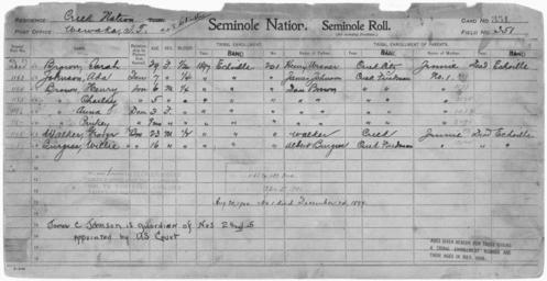 | Keywords: Enrollment for Seminole Census Card 351 - NARA - 267925.jpg Scope and content Name Anna Brown Type By Blood Age 3 Sex Female Degree Indian Blood 1/4 Roll Number 1186 City of Residence e Name Charley Brown Type By Blood Age 5 Sex Male Degree Indian Blood 1/4 Roll Number 1185 City of Residence e Name Dave Brown Type Parent Sex Male City of Residence Creek fr Name Henry Brown Type By Blood Age 6 Sex Male Degree Indian Blood 1/4 Roll Number 1184 City of Residence e Name Pinkey Brown Type By Blood Age 1 Sex Female Degree Indian Blood 1/4 Roll Number 1187 City of Residence e Name Sarah Brown Type By Blood Age 29 Sex Female Degree Indian Blood 1/2 City of Residence e Name Albert Burgess Type Parent Sex Male City of Residence Creek fr Name Willie Burgess Type By Blood Age 16 Sex Male Degree Indian Blood 1/2 Roll Number 1187 City of Residence e Name Ada Johnson Type By Blood Age 7 Sex Female Degree Indian Blood 1/4 Roll Number 1183 City of Residence e Name James Johnson Type Parent Sex Male City of Residence Creek fr Name George Walker Type By Blood Age 23 Sex Male Degree Indian Blood 1/2 Roll Number 1188 City of Residence e Name Henry Wisner Type Parent Sex Male City of Residence Creek General notes 267925 Local identifier 75-53A-SEMINOLE 351 Department of the Interior Office of Indian Affairs Office of the Commissioner to the Five Civilized Tribes 1893 - 1914 NARA's Southwest Region Fort Worth NRFA 1400 John Burgess Drive Fort Worth TX 76140 Record group Record Group 75 Records of the Bureau of Indian Affairs 1793 - 1999 Record group ARC 404 Enrollment Cards compiled 1898 - 1914 Series ARC 251747 File unit File unit ARC Variant control numbers NAIL Control Number NRFF-75-53A-25676<br /> NAIL Control Number NRFF-75-53A-25706<br /> NAIL Control Number NRFF-75-53A-25721<br /> NAIL Control Number NRFF-75-53A-25771<br /> NAIL Control Number NRFF-75-53A-25911<br /> NAIL Control Number NRFF-75-53A-25947<br /> NAIL Control Number NRFF-75-53A-26657<br /> NAIL Control Number NRFF-75-53A-26730<br /> NAIL Control Number NRFF-75-53A-37713<br /> NAIL Control Number NRFF-75-53A-37839<br /> NAIL Control Number NRFF-75-53A-50484<br /> NAIL Control Number NRFF-75-53A-51780<br /> NAIL Control Number NRFF-75-53A-SEMINOLE 351 Other versions <gallery> File Enrollment_for_Seminole_Census_Card_351_-_NARA_-_267925 tif tif File Enrollment_for_Seminole_Census_Card_351_-_NARA_-_267925 jpg jpg </gallery> NARA-cooperation PD-USGov Seminole census cards |