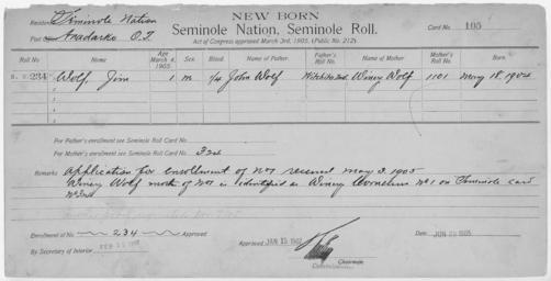| Keywords: Enrollment for Seminole Census Card 105 - NARA - 267679.tif Scope and content Name Acheiske Type Parent Sex Female City of Residence tp Name Alex Harjo Type By Blood Age 2 Sex Male Degree Indian Blood 3/4 Roll Number 372 City of Residence tp Name Duffie Harjo Type By Blood Age 18 Sex Male Degree Indian Blood 3/4 Roll Number 369 City of Residence tp Name Fanny Harjo Type By Blood Age 9 Sex Female Degree Indian Blood 3/4 Roll Number 371 City of Residence tp Name Jennie Harjo Type By Blood Age 45 Sex Female Degree Indian Blood 1/2 Roll Number 368 City of Residence tp Name Passuk Harjo Type By Blood Age 65 Sex Male Degree Indian Blood Full Roll Number 367 City of Residence tp Name Sarah Harjo Type By Blood Age 4 Sex Female Degree Indian Blood 3/4 City of Residence tp Name Webster Harjo Type By Blood Age 12 Sex Male Degree Indian Blood 3/4 Roll Number 370 City of Residence tp Name Madelia Type Parent Sex Female City of Residence tp Name Hobiah Palmer Type Parent Sex Male City of Residence Creek Name Jim Wolf Type Newborn Age 1 Sex Male Degree Indian Blood 1/4 Roll Number 234 Post Office Anadarko General notes 267679 Local identifier 75-53A-SEMINOLE 105 Department of the Interior Office of Indian Affairs Office of the Commissioner to the Five Civilized Tribes 1893 - 1914 NARA's Southwest Region Fort Worth NRFA 1400 John Burgess Drive Fort Worth TX 76140 Record group Record Group 75 Records of the Bureau of Indian Affairs 1793 - 1999 Record group ARC 404 Enrollment Cards compiled 1898 - 1914 Series ARC 251747 File unit File unit ARC Variant control numbers NAIL Control Number NRFF-75-53A-22665<br /> NAIL Control Number NRFF-75-53A-34057<br /> NAIL Control Number NRFF-75-53A-34282<br /> NAIL Control Number NRFF-75-53A-34325<br /> NAIL Control Number NRFF-75-53A-34479<br /> NAIL Control Number NRFF-75-53A-34957<br /> NAIL Control Number NRFF-75-53A-35033<br /> NAIL Control Number NRFF-75-53A-35265<br /> NAIL Control Number NRFF-75-53A-40282<br /> NAIL Control Number NRFF-75-53A-43506<br /> NAIL Control Number NRFF-75-53A-52675<br /> NAIL Control Number NRFF-75-53A-SEMINOLE 105 yes Other versions <gallery> File Enrollment_for_Seminole_Census_Card_105_-_NARA_-_267679 tif tif File Enrollment_for_Seminole_Census_Card_105_-_NARA_-_267679 jpg jpg </gallery> NARA-cooperation PD-USGov Cherokee census cards NARA TIF images with categorized JPGs |