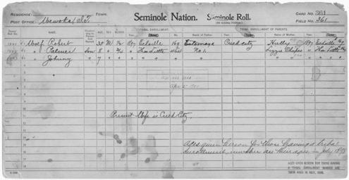 | Keywords: Enrollment for Seminole Census Card 361 - NARA - 267935.tif Scope and content Name Lizzie Chupco Type Parent Sex Female City of Residence tl Name Estemaya Type Parent Sex Male City of Residence Creek Name Hully Type Parent Sex Female City of Residence e Name Johnny Wolf Type By Blood Age 7 Sex Male Degree Indian Blood 3/4 Roll Number 1223 City of Residence tl Name Palmer Wolf Type By Blood Age 8 Sex Male Degree Indian Blood 3/4 Roll Number 1222 City of Residence tl Name Robert Wolf Type By Blood Age 35 Sex Male Degree Indian Blood 1/2 Roll Number 1221 City of Residence e General notes 267935 Local identifier 75-53A-SEMINOLE 361 Department of the Interior Office of Indian Affairs Office of the Commissioner to the Five Civilized Tribes 1893 - 1914 NARA's Southwest Region Fort Worth NRFA 1400 John Burgess Drive Fort Worth TX 76140 Record group Record Group 75 Records of the Bureau of Indian Affairs 1793 - 1999 Record group ARC 404 Enrollment Cards compiled 1898 - 1914 Series ARC 251747 File unit File unit ARC Variant control numbers NAIL Control Number NRFF-75-53A-28102<br /> NAIL Control Number NRFF-75-53A-31079<br /> NAIL Control Number NRFF-75-53A-36900<br /> NAIL Control Number NRFF-75-53A-51855<br /> NAIL Control Number NRFF-75-53A-51883<br /> NAIL Control Number NRFF-75-53A-51886<br /> NAIL Control Number NRFF-75-53A-SEMINOLE 361 yes Other versions <gallery> File Enrollment_for_Seminole_Census_Card_361_-_NARA_-_267935 tif tif File Enrollment_for_Seminole_Census_Card_361_-_NARA_-_267935 jpg jpg </gallery> NARA-cooperation PD-USGov Seminole census cards NARA TIF images with categorized JPGs |