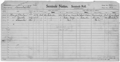 | Keywords: Enrollment for Seminole Census Card 363 - NARA - 267937.tif Scope and content Name Coahsa Fixico Type Parent Sex Male City of Residence sb Name Losoche Harjo Type By Blood Age 7 Sex Female Degree Indian Blood Full Roll Number 1227 City of Residence e Name Martha Harjo Type By Blood Age 25 Sex Female Degree Indian Blood Full Roll Number 1226 City of Residence e Name Okchan Harjo Type By Blood Age 56 Sex Male Degree Indian Blood Full Roll Number 1225 City of Residence e Name Hully Type Parent Sex Female City of Residence e Name Wanahye Type Parent Sex Female City of Residence sb Name Yaha Wolf Type Parent Sex Male City of Residence e General notes 267937 Local identifier 75-53A-SEMINOLE 363 Department of the Interior Office of Indian Affairs Office of the Commissioner to the Five Civilized Tribes 1893 - 1914 NARA's Southwest Region Fort Worth NRFA 1400 John Burgess Drive Fort Worth TX 76140 Record group Record Group 75 Records of the Bureau of Indian Affairs 1793 - 1999 Record group ARC 404 Enrollment Cards compiled 1898 - 1914 Series ARC 251747 File unit File unit ARC Variant control numbers NAIL Control Number NRFF-75-53A-31858<br /> NAIL Control Number NRFF-75-53A-34624<br /> NAIL Control Number NRFF-75-53A-34705<br /> NAIL Control Number NRFF-75-53A-34897<br /> NAIL Control Number NRFF-75-53A-36901<br /> NAIL Control Number NRFF-75-53A-50584<br /> NAIL Control Number NRFF-75-53A-51913<br /> NAIL Control Number NRFF-75-53A-SEMINOLE 363 yes Other versions <gallery> File Enrollment_for_Seminole_Census_Card_363_-_NARA_-_267937 tif tif File Enrollment_for_Seminole_Census_Card_363_-_NARA_-_267937 jpg jpg </gallery> NARA-cooperation PD-USGov Seminole census cards NARA TIF images with categorized JPGs |