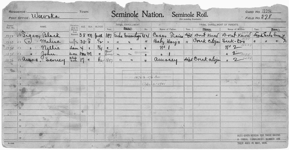 | Keywords: Enrollment for Seminole Census Card 378 - NARA - 267952.tif Scope and content Name Sarney Amos Type By Blood Age 17 Sex Male Degree Indian Blood 1/2 Roll Number 1276 City of Residence ee Name Cosar Fixico Type Parent Sex Male Name Suktoo Type Parent Sex Female City of Residence ee Name Black Tiger Type By Blood Age 38 Sex Male Degree Indian Blood Full Roll Number 1272 City of Residence ee Name John Tiger Type By Blood Age 1 Sex Male Degree Indian Blood 3/4 Roll Number 1275 City of Residence ee Name Malesa Tiger Type By Blood Age 35 Sex Female Degree Indian Blood 1/2 Roll Number 1273 City of Residence ee Name Nellie Tiger Type By Blood Age 4 Sex Female Degree Indian Blood 3/4 Roll Number 1274 City of Residence ee General notes 267952 Local identifier 75-53A-SEMINOLE 378 Department of the Interior Office of Indian Affairs Office of the Commissioner to the Five Civilized Tribes 1893 - 1914 NARA's Southwest Region Fort Worth NRFA 1400 John Burgess Drive Fort Worth TX 76140 Record group Record Group 75 Records of the Bureau of Indian Affairs 1793 - 1999 Record group ARC 404 Enrollment Cards compiled 1898 - 1914 Series ARC 251747 File unit File unit ARC Variant control numbers NAIL Control Number NRFF-75-53A-23093<br /> NAIL Control Number NRFF-75-53A-31869<br /> NAIL Control Number NRFF-75-53A-48239<br /> NAIL Control Number NRFF-75-53A-49381<br /> NAIL Control Number NRFF-75-53A-49563<br /> NAIL Control Number NRFF-75-53A-49662<br /> NAIL Control Number NRFF-75-53A-49725<br /> NAIL Control Number NRFF-75-53A-SEMINOLE 378 yes Other versions <gallery> File Enrollment_for_Seminole_Census_Card_378_-_NARA_-_267952 tif tif File Enrollment_for_Seminole_Census_Card_378_-_NARA_-_267952 jpg jpg </gallery> NARA-cooperation PD-USGov Seminole census cards NARA TIF images with categorized JPGs |