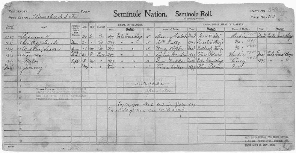 | Keywords: Enrollment for Seminole Census Card 383 - NARA - 267957.jpg Scope and content Name Louis Carcher Type Parent Sex Male City of Residence tp Name Louie Cotser Type Parent Sex Male City of Residence tp Name Sarah Cully Type By Blood Age 20 Sex Female Degree Indian Blood 3/4 Roll Number 1288 City of Residence ee Name William Cully Type Parent Sex Male City of Residence th Name Spanny Harlocko Type Parent Sex Male City of Residence Creek Name Jimmy Type By Blood Age 1 Sex Male Degree Indian Blood Full City of Residence ee Name Lowesa Type By Blood Age 20 Sex Female Degree Indian Blood Full Roll Number 1290 City of Residence ee Name Lucy Type Parent Sex Female City of Residence ee Name Fus Mekko Type Parent Sex Male City of Residence ee Name Melo Type By Blood Age 8 Sex Male Degree Indian Blood Full Roll Number 1291 City of Residence ee Name Rosanna Type By Blood Age 40 Sex Female Degree Indian Blood 1/2 Roll Number 1287 City of Residence ee Name Sudie Type Parent Sex Female City of Residence ee Name Marcy Walker Type Parent Sex Male City of Residence nh Name Seaver Walker Type By Blood Age 15 Sex Male Degree Indian Blood 3/4 Roll Number 1289 City of Residence ee General notes 267957 Local identifier 75-53A-SEMINOLE 383 Department of the Interior Office of Indian Affairs Office of the Commissioner to the Five Civilized Tribes 1893 - 1914 NARA's Southwest Region Fort Worth NRFA 1400 John Burgess Drive Fort Worth TX 76140 Record group Record Group 75 Records of the Bureau of Indian Affairs 1793 - 1999 Record group ARC 404 Enrollment Cards compiled 1898 - 1914 Series ARC 251747 File unit File unit ARC Variant control numbers NAIL Control Number NRFF-75-53A-27119<br /> NAIL Control Number NRFF-75-53A-28967<br /> NAIL Control Number NRFF-75-53A-29338<br /> NAIL Control Number NRFF-75-53A-29343<br /> NAIL Control Number NRFF-75-53A-35465<br /> NAIL Control Number NRFF-75-53A-37626<br /> NAIL Control Number NRFF-75-53A-40074<br /> NAIL Control Number NRFF-75-53A-40175<br /> NAIL Control Number NRFF-75-53A-41746<br /> NAIL Control Number NRFF-75-53A-41786<br /> NAIL Control Number NRFF-75-53A-45423<br /> NAIL Control Number NRFF-75-53A-48181<br /> NAIL Control Number NRFF-75-53A-50522<br /> NAIL Control Number NRFF-75-53A-50539<br /> NAIL Control Number NRFF-75-53A-SEMINOLE 383 Other versions <gallery> File Enrollment_for_Seminole_Census_Card_383_-_NARA_-_267957 tif tif File Enrollment_for_Seminole_Census_Card_383_-_NARA_-_267957 jpg jpg </gallery> NARA-cooperation PD-USGov Seminole census cards |