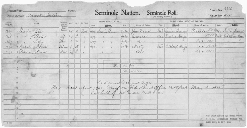 | Keywords: Enrollment for Seminole Census Card 412 - NARA - 267986.jpg Scope and content Name Cowake Type Parent Sex Male City of Residence th Name Anna Davis Type By Blood Age 1 Sex Female Degree Indian Blood Full Roll Number 1371 City of Residence sb Name Jim Davis Type By Blood Age 25 Sex Male Degree Indian Blood Full Roll Number 1367 City of Residence sb Name Jim Davis Type Parent Sex Male City of Residence sb Name Lilly Davis Type By Blood Age 1 Sex Female Degree Indian Blood Full Roll Number 1369 City of Residence sb Name Rhoda Davis Type By Blood Age 23 Sex Female Degree Indian Blood Full Roll Number 1368 City of Residence sb Name Marty Type Parent Sex Male City of Residence nh Name Passake Type Parent Sex Female City of Residence sb Name Davis Yahola Type By Blood Age 8 Sex Male Degree Indian Blood Full Roll Number 1370 City of Residence sb General notes 267986 Local identifier 75-53A-SEMINOLE 412 Department of the Interior Office of Indian Affairs Office of the Commissioner to the Five Civilized Tribes 1893 - 1914 NARA's Southwest Region Fort Worth NRFA 1400 John Burgess Drive Fort Worth TX 76140 Record group Record Group 75 Records of the Bureau of Indian Affairs 1793 - 1999 Record group ARC 404 Enrollment Cards compiled 1898 - 1914 Series ARC 251747 File unit File unit ARC Variant control numbers NAIL Control Number NRFF-75-53A-28989<br /> NAIL Control Number NRFF-75-53A-29564<br /> NAIL Control Number NRFF-75-53A-29760<br /> NAIL Control Number NRFF-75-53A-29761<br /> NAIL Control Number NRFF-75-53A-29826<br /> NAIL Control Number NRFF-75-53A-29922<br /> NAIL Control Number NRFF-75-53A-40789<br /> NAIL Control Number NRFF-75-53A-43661<br /> NAIL Control Number NRFF-75-53A-52107<br /> NAIL Control Number NRFF-75-53A-SEMINOLE 412 Other versions <gallery> File Enrollment_for_Seminole_Census_Card_412_-_NARA_-_267986 tif tif File Enrollment_for_Seminole_Census_Card_412_-_NARA_-_267986 jpg jpg </gallery> NARA-cooperation PD-USGov Seminole census cards |