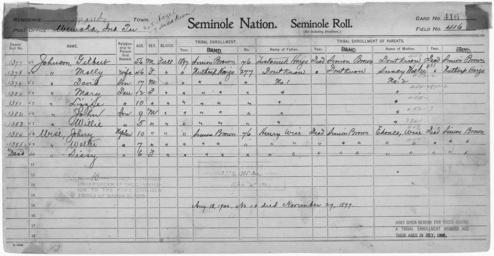 | Keywords: Enrollment for Seminole Census Card 416 - NARA - 267990.tif Scope and content Name Tustanuk Harjo Type Parent Sex Male City of Residence sb Name David Johnson Type By Blood Age 17 Sex Male Degree Indian Blood Full Roll Number 1379 City of Residence nh Name Gilbert Johnson Type By Blood Age 56 Sex Male Degree Indian Blood Full Roll Number 1377 City of Residence sb Name John Johnson Type By Blood Age 9 Sex Male Degree Indian Blood Full Roll Number 1382 City of Residence nh Name Lizzie Johnson Type By Blood Age 10 Sex Female Degree Indian Blood Full Roll Number 1381 City of Residence nh Name Mary Johnson Type By Blood Age 12 Sex Female Degree Indian Blood Full Roll Number 1380 City of Residence nh Name Molly Johnson Type By Blood Age 46 Sex Female Degree Indian Blood Full Roll Number 1378 City of Residence nh Name Willie Johnson Type By Blood Age 5 Sex Male Degree Indian Blood Full Roll Number 1383 City of Residence nh Name Susey Walker Type Parent Sex Female City of Residence nh Name Ehonco Wise Type Parent Sex Female City of Residence sb Name Henry Wise Type Parent Sex Male City of Residence sb Name Johny Wise Type By Blood Age 10 Sex Male Degree Indian Blood Full Roll Number 1384 City of Residence nh Name Sissy Wise Type By Blood Age 6 Sex Female Degree Indian Blood Full City of Residence sb Name Walter Wise Type By Blood Age 7 Sex Male Degree Indian Blood Full Roll Number 1385 City of Residence sb General notes 267990 Local identifier 75-53A-SEMINOLE 416 Department of the Interior Office of Indian Affairs Office of the Commissioner to the Five Civilized Tribes 1893 - 1914 NARA's Southwest Region Fort Worth NRFA 1400 John Burgess Drive Fort Worth TX 76140 Record group Record Group 75 Records of the Bureau of Indian Affairs 1793 - 1999 Record group ARC 404 Enrollment Cards compiled 1898 - 1914 Series ARC 251747 File unit File unit ARC Variant control numbers NAIL Control Number NRFF-75-53A-35241<br /> NAIL Control Number NRFF-75-53A-37773<br /> NAIL Control Number NRFF-75-53A-37818<br /> NAIL Control Number NRFF-75-53A-37856<br /> NAIL Control Number NRFF-75-53A-37875<br /> NAIL Control Number NRFF-75-53A-37892<br /> NAIL Control Number NRFF-75-53A-37908<br /> NAIL Control Number NRFF-75-53A-37998<br /> NAIL Control Number NRFF-75-53A-50543<br /> NAIL Control Number NRFF-75-53A-51737<br /> NAIL Control Number NRFF-75-53A-51738<br /> NAIL Control Number NRFF-75-53A-51739<br /> NAIL Control Number NRFF-75-53A-51740<br /> NAIL Control Number NRFF-75-53A-51741<br /> NAIL Control Number NRFF-75-53A-SEMINOLE 416 yes Other versions <gallery> File Enrollment_for_Seminole_Census_Card_416_-_NARA_-_267990 tif tif File Enrollment_for_Seminole_Census_Card_416_-_NARA_-_267990 jpg jpg </gallery> NARA-cooperation PD-USGov Seminole census cards NARA TIF images with categorized JPGs |
