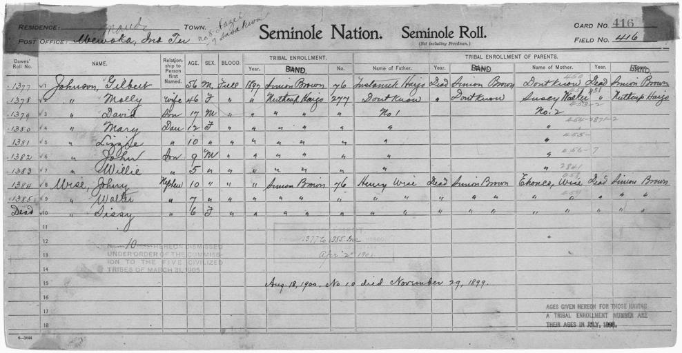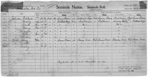 | Keywords: Enrollment for Seminole Census Card 416 - NARA - 267990.jpg Scope and content Name Tustanuk Harjo Type Parent Sex Male City of Residence sb Name David Johnson Type By Blood Age 17 Sex Male Degree Indian Blood Full Roll Number 1379 City of Residence nh Name Gilbert Johnson Type By Blood Age 56 Sex Male Degree Indian Blood Full Roll Number 1377 City of Residence sb Name John Johnson Type By Blood Age 9 Sex Male Degree Indian Blood Full Roll Number 1382 City of Residence nh Name Lizzie Johnson Type By Blood Age 10 Sex Female Degree Indian Blood Full Roll Number 1381 City of Residence nh Name Mary Johnson Type By Blood Age 12 Sex Female Degree Indian Blood Full Roll Number 1380 City of Residence nh Name Molly Johnson Type By Blood Age 46 Sex Female Degree Indian Blood Full Roll Number 1378 City of Residence nh Name Willie Johnson Type By Blood Age 5 Sex Male Degree Indian Blood Full Roll Number 1383 City of Residence nh Name Susey Walker Type Parent Sex Female City of Residence nh Name Ehonco Wise Type Parent Sex Female City of Residence sb Name Henry Wise Type Parent Sex Male City of Residence sb Name Johny Wise Type By Blood Age 10 Sex Male Degree Indian Blood Full Roll Number 1384 City of Residence nh Name Sissy Wise Type By Blood Age 6 Sex Female Degree Indian Blood Full City of Residence sb Name Walter Wise Type By Blood Age 7 Sex Male Degree Indian Blood Full Roll Number 1385 City of Residence sb General notes 267990 Local identifier 75-53A-SEMINOLE 416 Department of the Interior Office of Indian Affairs Office of the Commissioner to the Five Civilized Tribes 1893 - 1914 NARA's Southwest Region Fort Worth NRFA 1400 John Burgess Drive Fort Worth TX 76140 Record group Record Group 75 Records of the Bureau of Indian Affairs 1793 - 1999 Record group ARC 404 Enrollment Cards compiled 1898 - 1914 Series ARC 251747 File unit File unit ARC Variant control numbers NAIL Control Number NRFF-75-53A-35241<br /> NAIL Control Number NRFF-75-53A-37773<br /> NAIL Control Number NRFF-75-53A-37818<br /> NAIL Control Number NRFF-75-53A-37856<br /> NAIL Control Number NRFF-75-53A-37875<br /> NAIL Control Number NRFF-75-53A-37892<br /> NAIL Control Number NRFF-75-53A-37908<br /> NAIL Control Number NRFF-75-53A-37998<br /> NAIL Control Number NRFF-75-53A-50543<br /> NAIL Control Number NRFF-75-53A-51737<br /> NAIL Control Number NRFF-75-53A-51738<br /> NAIL Control Number NRFF-75-53A-51739<br /> NAIL Control Number NRFF-75-53A-51740<br /> NAIL Control Number NRFF-75-53A-51741<br /> NAIL Control Number NRFF-75-53A-SEMINOLE 416 Other versions <gallery> File Enrollment_for_Seminole_Census_Card_416_-_NARA_-_267990 tif tif File Enrollment_for_Seminole_Census_Card_416_-_NARA_-_267990 jpg jpg </gallery> NARA-cooperation PD-USGov Seminole census cards |