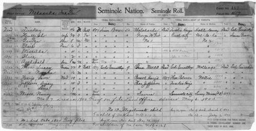 | Keywords: Enrollment for Seminole Census Card 417 - NARA - 267991.tif Scope and content Name Ahalokoche Type Parent Sex Male City of Residence th Name Alice Type By Blood Age 2 Sex Female Degree Indian Blood 3/4 Roll Number 1390 City of Residence sb Name Archibald Type By Blood Age 1 Sex Male Degree Indian Blood 3/4 Roll Number 1391 City of Residence sb Name Dickey Type By Blood Age 46 Sex Male Degree Indian Blood Full City of Residence sb Name Elsie Type By Blood Age 6 Sex Female Degree Indian Blood 3/4 Roll Number 1388 City of Residence sb Name George Type By Blood Age 8 Sex Male Degree Indian Blood 3/4 Roll Number 1387 City of Residence sb Name Possok Harjo Type Parent Sex Male City of Residence tp Name Sam Harjo Type By Blood Age 19 Sex Male Degree Indian Blood Full Roll Number 1393 City of Residence ee Name Hoktilamey Type Parent Sex Female City of Residence ee Name Hulleah Type By Blood Age 24 Sex Female Degree Indian Blood 1/2 Roll Number 1386 City of Residence sb Name Lena Jefferson Type By Blood Age 9 Sex Female Degree Indian Blood Full Roll Number 1395 City of Residence ee Name Sissy Jefferson Type By Blood Age 14 Sex Female Degree Indian Blood Full Roll Number 1394 City of Residence ee Name Thomas Jefferson Type Parent Sex Male City of Residence th Name George McGirt Type Parent Sex Male City of Residence Creek Name Fus Mecco Type Parent Sex Male City of Residence ee Name Nancy Micco Type By Blood Age 1 Sex Female Degree Indian Blood Full City of Residence ee Name Noska Micco Type By Blood Age 16 Sex Male Degree Indian Blood Full City of Residence ee Name Susey Micco Type By Blood Age 22 Sex Female Degree Indian Blood Full Roll Number 1392 City of Residence ee Name Misselda Type By Blood Age 4 Sex Female Degree Indian Blood 3/4 Roll Number 1389 City of Residence sb Name Molleago Type Parent Sex Female City of Residence ee Name Nellie Type Parent Sex Female City of Residence ee Name Welake Type Parent Sex Female City of Residence sb General notes 267991 Local identifier 75-53A-SEMINOLE 417 Department of the Interior Office of Indian Affairs Office of the Commissioner to the Five Civilized Tribes 1893 - 1914 NARA's Southwest Region Fort Worth NRFA 1400 John Burgess Drive Fort Worth TX 76140 Record group Record Group 75 Records of the Bureau of Indian Affairs 1793 - 1999 Record group ARC 404 Enrollment Cards compiled 1898 - 1914 Series ARC 251747 File unit File unit ARC Variant control numbers NAIL Control Number NRFF-75-53A-22807<br /> NAIL Control Number NRFF-75-53A-23016<br /> NAIL Control Number NRFF-75-53A-23336<br /> NAIL Control Number NRFF-75-53A-30410<br /> NAIL Control Number NRFF-75-53A-30843<br /> NAIL Control Number NRFF-75-53A-32868<br /> NAIL Control Number NRFF-75-53A-34996<br /> NAIL Control Number NRFF-75-53A-35022<br /> NAIL Control Number NRFF-75-53A-36511<br /> NAIL Control Number NRFF-75-53A-36888<br /> NAIL Control Number NRFF-75-53A-37491<br /> NAIL Control Number NRFF-75-53A-37509<br /> NAIL Control Number NRFF-75-53A-37515<br /> NAIL Control Number NRFF-75-53A-41172<br /> NAIL Control Number NRFF-75-53A-41721<br /> NAIL Control Number NRFF-75-53A-41906<br /> NAIL Control Number NRFF-75-53A-41911<br /> NAIL Control Number NRFF-75-53A-41928<br /> NAIL Control Number NRFF-75-53A-42265<br /> NAIL Control Number NRFF-75-53A-42371<br /> NAIL Control Number NRFF-75-53A-43043<br /> NAIL Control Number NRFF-75-53A-50945<br /> NAIL Control Number NRFF-75-53A-SEMINOLE 417 yes Other versions <gallery> File Enrollment_for_Seminole_Census_Card_417_-_NARA_-_267991 tif tif File Enrollment_for_Seminole_Census_Card_417_-_NARA_-_267991 jpg jpg </gallery> NARA-cooperation PD-USGov Seminole census cards NARA TIF images with categorized JPGs |