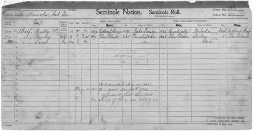 | Keywords: Enrollment for Seminole Census Card 419 - NARA - 267993.jpg Scope and content Name Yaha Fixico Type Parent Sex Male City of Residence Creek Name Foushutche Type Parent Sex Male City of Residence tp Name Melake Type Parent Sex Female City of Residence nh Name Seeley Type Parent Sex Female City of Residence tp Name Hully Wolf Type By Blood Age 19 Sex Male Degree Indian Blood 1/2 Roll Number 1398 City of Residence nh Name Lena Wolf Type By Blood Age 1 Sex Female Degree Indian Blood 3/4 Roll Number 1400 City of Residence tp Name Nancy Wolf Type By Blood Age 18 Sex Female Degree Indian Blood Full Roll Number 1399 City of Residence tp General notes 267993 Local identifier 75-53A-SEMINOLE 419 Department of the Interior Office of Indian Affairs Office of the Commissioner to the Five Civilized Tribes 1893 - 1914 NARA's Southwest Region Fort Worth NRFA 1400 John Burgess Drive Fort Worth TX 76140 Record group Record Group 75 Records of the Bureau of Indian Affairs 1793 - 1999 Record group ARC 404 Enrollment Cards compiled 1898 - 1914 Series ARC 251747 File unit File unit ARC Variant control numbers NAIL Control Number NRFF-75-53A-32140<br /> NAIL Control Number NRFF-75-53A-32406<br /> NAIL Control Number NRFF-75-53A-41760<br /> NAIL Control Number NRFF-75-53A-46432<br /> NAIL Control Number NRFF-75-53A-51837<br /> NAIL Control Number NRFF-75-53A-51862<br /> NAIL Control Number NRFF-75-53A-51880<br /> NAIL Control Number NRFF-75-53A-SEMINOLE 419 Other versions <gallery> File Enrollment_for_Seminole_Census_Card_419_-_NARA_-_267993 tif tif File Enrollment_for_Seminole_Census_Card_419_-_NARA_-_267993 jpg jpg </gallery> NARA-cooperation PD-USGov Seminole census cards |