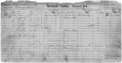 | Keywords: Enrollment for Seminole Census Card 424 - NARA - 267998.jpg Scope and content Name Alabama Chupco Type Parent Sex Male City of Residence Creek Name Charlie Chupco Type By Blood Age 11 Sex Male Degree Indian Blood 1/4 Roll Number 1416 City of Residence sb Name Hannah Chupco Type By Blood Age 1 Sex Female Degree Indian Blood 1/4 Roll Number 1418 City of Residence sb Name Jimmey Chupco Type By Blood Age 2 Sex Male Degree Indian Blood 1/4 Roll Number 1417 City of Residence sb Name Johnny Chupco Type By Blood Age 30 Sex Male Degree Indian Blood 1/4 Roll Number 1413 City of Residence sb Name Lizzie Chupco Type By Blood Age 17 Sex Female Degree Indian Blood 1/4 Roll Number 1415 City of Residence sb Name Lucy Chupco Type By Blood Age 27 Sex Female Degree Indian Blood 1/4 Roll Number 1414 City of Residence sb Name Tena Chupco Type By Blood Age 55 Sex Female Degree Indian Blood 1/2 Roll Number 1412 City of Residence sb Name William Chupco Type Parent Sex Male City of Residence Creek Name Chocotte Harjo Type Parent Sex Male City of Residence Creek General notes 267998 Local identifier 75-53A-SEMINOLE 424 Department of the Interior Office of Indian Affairs Office of the Commissioner to the Five Civilized Tribes 1893 - 1914 NARA's Southwest Region Fort Worth NRFA 1400 John Burgess Drive Fort Worth TX 76140 Record group Record Group 75 Records of the Bureau of Indian Affairs 1793 - 1999 Record group ARC 404 Enrollment Cards compiled 1898 - 1914 Series ARC 251747 File unit File unit ARC Variant control numbers NAIL Control Number NRFF-75-53A-28053<br /> NAIL Control Number NRFF-75-53A-28060<br /> NAIL Control Number NRFF-75-53A-28077<br /> NAIL Control Number NRFF-75-53A-28087<br /> NAIL Control Number NRFF-75-53A-28090<br /> NAIL Control Number NRFF-75-53A-28103<br /> NAIL Control Number NRFF-75-53A-28111<br /> NAIL Control Number NRFF-75-53A-28156<br /> NAIL Control Number NRFF-75-53A-28172<br /> NAIL Control Number NRFF-75-53A-34199<br /> NAIL Control Number NRFF-75-53A-SEMINOLE 424 Other versions <gallery> File Enrollment_for_Seminole_Census_Card_424_-_NARA_-_267998 tif tif File Enrollment_for_Seminole_Census_Card_424_-_NARA_-_267998 jpg jpg </gallery> NARA-cooperation PD-USGov Seminole census cards |