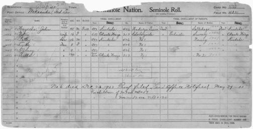 | Keywords: Enrollment for Seminole Census Card 432 - NARA - 268006.tif Scope and content Name Choharjoche Type Parent Sex Male City of Residence e Name Hodulga Fixico Type Parent Sex Male Name John Hayecha Type By Blood Age 45 Sex Male Degree Indian Blood Full Roll Number 1445 City of Residence k Name Lucy Type By Blood Age 8 Sex Female Degree Indian Blood Full Roll Number 1448 City of Residence k Name Nitey Type By Blood Age 16 Sex Female Degree Indian Blood Full Roll Number 1446 City of Residence oh Name Pottey Type By Blood Age 16 Sex Male Degree Indian Blood Full Roll Number 1447 City of Residence k Name Salledago Type Parent Sex Female City of Residence k Name Susey Type Parent Sex Female City of Residence oh Name Tulla Type By Blood Age 1 Sex Female Degree Indian Blood Full Roll Number 1450 City of Residence oh Name Winey Type By Blood Age 9 Sex Female Degree Indian Blood Full Roll Number 1449 City of Residence k General notes 268006 Local identifier 75-53A-SEMINOLE 432 Department of the Interior Office of Indian Affairs Office of the Commissioner to the Five Civilized Tribes 1893 - 1914 NARA's Southwest Region Fort Worth NRFA 1400 John Burgess Drive Fort Worth TX 76140 Record group Record Group 75 Records of the Bureau of Indian Affairs 1793 - 1999 Record group ARC 404 Enrollment Cards compiled 1898 - 1914 Series ARC 251747 File unit File unit ARC Variant control numbers NAIL Control Number NRFF-75-53A-27979<br /> NAIL Control Number NRFF-75-53A-31916<br /> NAIL Control Number NRFF-75-53A-35880<br /> NAIL Control Number NRFF-75-53A-40176<br /> NAIL Control Number NRFF-75-53A-43185<br /> NAIL Control Number NRFF-75-53A-44597<br /> NAIL Control Number NRFF-75-53A-45600<br /> NAIL Control Number NRFF-75-53A-48415<br /> NAIL Control Number NRFF-75-53A-50110<br /> NAIL Control Number NRFF-75-53A-51696<br /> NAIL Control Number NRFF-75-53A-SEMINOLE 432 yes Other versions <gallery> File Enrollment_for_Seminole_Census_Card_432_-_NARA_-_268006 tif tif File Enrollment_for_Seminole_Census_Card_432_-_NARA_-_268006 jpg jpg </gallery> NARA-cooperation PD-USGov Seminole census cards NARA TIF images with categorized JPGs |