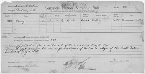 | Keywords: Enrollment for Seminole Census Card 123 - NARA - 267697.tif Scope and content Name Concharty Type Parent Sex Male City of Residence yh Name George Davis Type By Blood Age 19 Sex Male Degree Indian Blood Full Roll Number 423 City of Residence ee Name Jennie Davis Type By Blood Age 22 Sex Female Degree Indian Blood Full Roll Number 424 City of Residence th Name Legus Davis Type By Blood Age 4 Sex Male Degree Indian Blood Full Roll Number 427 City of Residence ee Name Lula Davis Type By Blood Age 1 Sex Female Degree Indian Blood Full Roll Number 428 City of Residence th Name Hotogee Type Parent Sex Female City of Residence th Name Kiltkoge Type Parent Sex Female City of Residence ee Name Ned Lustey Type By Blood Age 5 Sex Male Degree Indian Blood Full Roll Number 42 City of Residence th Name Thomas Lustey Type By Blood Age 7 Sex Male Degree Indian Blood Full Roll Number 425 City of Residence th Name Punlustey Type Parent Sex Male City of Residence ee Name Dave Tulsa Type Parent Sex Male City of Residence ee Name Nancy Type Newborn Age 2 Sex Female Degree Indian Blood 1/2 Roll Number 218 Post Office Paden General notes 267697 Local identifier 75-53A-SEMINOLE 123 Department of the Interior Office of Indian Affairs Office of the Commissioner to the Five Civilized Tribes 1893 - 1914 NARA's Southwest Region Fort Worth NRFA 1400 John Burgess Drive Fort Worth TX 76140 Record group Record Group 75 Records of the Bureau of Indian Affairs 1793 - 1999 Record group ARC 404 Enrollment Cards compiled 1898 - 1914 Series ARC 251747 File unit File unit ARC Variant control numbers NAIL Control Number NRFF-75-53A-28664<br /> NAIL Control Number NRFF-75-53A-29691<br /> NAIL Control Number NRFF-75-53A-29742<br /> NAIL Control Number NRFF-75-53A-29813<br /> NAIL Control Number NRFF-75-53A-29843<br /> NAIL Control Number NRFF-75-53A-36782<br /> NAIL Control Number NRFF-75-53A-38664<br /> NAIL Control Number NRFF-75-53A-40219<br /> NAIL Control Number NRFF-75-53A-40220<br /> NAIL Control Number NRFF-75-53A-44747<br /> NAIL Control Number NRFF-75-53A-50126<br /> NAIL Control Number NRFF-75-53A-52700<br /> NAIL Control Number NRFF-75-53A-SEMINOLE 123 yes Other versions <gallery> File Enrollment_for_Seminole_Census_Card_123_-_NARA_-_267697 tif tif File Enrollment_for_Seminole_Census_Card_123_-_NARA_-_267697 jpg jpg </gallery> NARA-cooperation PD-USGov Cherokee census cards NARA TIF images with categorized JPGs |
