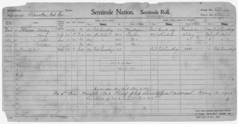 | Keywords: Enrollment for Seminole Census Card 450 - NARA - 268024.tif Scope and content Name Hesahoka Type Parent Sex Female City of Residence ee Name Hesahoka Type By Blood Age 55 Sex Female Degree Indian Blood Full Roll Number 1518 City of Residence ee Name Muskogee Type Parent Sex Male City of Residence Creek Name Seley Type Parent Sex Female City of Residence k Name Tewee Type Parent Sex Male City of Residence k Name Amey Thlocco Type By Blood Age 20 Sex Female Degree Indian Blood Full Roll Number 1515 City of Residence k Name Jacob Thlocco Type By Blood Age 8 Sex Male Degree Indian Blood 3/4 Roll Number 1516 City of Residence k Name Whitlow Thlocco Type By Blood Age 5 Sex Male Degree Indian Blood 3/4 Roll Number 1517 City of Residence k Name Wiley Thlocco Type By Blood Age 35 Sex Male Degree Indian Blood 1/2 City of Residence ee General notes 268024 Local identifier 75-53A-SEMINOLE 450 Department of the Interior Office of Indian Affairs Office of the Commissioner to the Five Civilized Tribes 1893 - 1914 NARA's Southwest Region Fort Worth NRFA 1400 John Burgess Drive Fort Worth TX 76140 Record group Record Group 75 Records of the Bureau of Indian Affairs 1793 - 1999 Record group ARC 404 Enrollment Cards compiled 1898 - 1914 Series ARC 251747 File unit File unit ARC Variant control numbers NAIL Control Number NRFF-75-53A-36155<br /> NAIL Control Number NRFF-75-53A-36156<br /> NAIL Control Number NRFF-75-53A-42865<br /> NAIL Control Number NRFF-75-53A-46458<br /> NAIL Control Number NRFF-75-53A-48915<br /> NAIL Control Number NRFF-75-53A-48963<br /> NAIL Control Number NRFF-75-53A-48980<br /> NAIL Control Number NRFF-75-53A-48996<br /> NAIL Control Number NRFF-75-53A-48997<br /> NAIL Control Number NRFF-75-53A-SEMINOLE 450 yes Other versions <gallery> File Enrollment_for_Seminole_Census_Card_450_-_NARA_-_268024 tif tif File Enrollment_for_Seminole_Census_Card_450_-_NARA_-_268024 jpg jpg </gallery> NARA-cooperation PD-USGov Seminole census cards NARA TIF images with categorized JPGs |