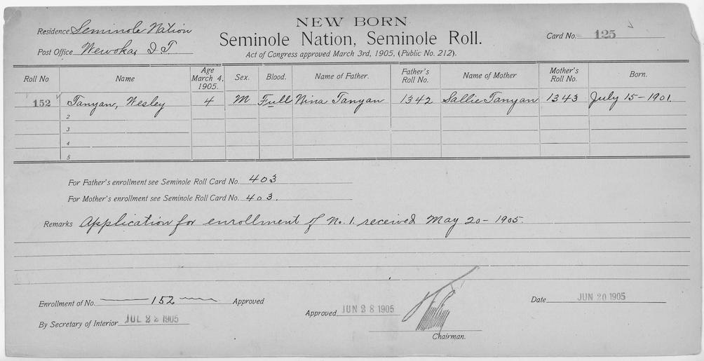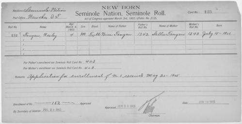 | Keywords: Enrollment for Seminole Census Card 125 - NARA - 267699.tif Scope and content Name Alec Type By Blood Age 2 Sex Male Degree Indian Blood Full Roll Number 436 City of Residence yh Name Charley Amartha Type Parent Sex Male City of Residence yh Name Cheparney Type By Blood Age 4 Sex Male Degree Indian Blood Full Roll Number 434 City of Residence yh Name Chosey Type By Blood Age 7 Sex Male Degree Indian Blood Full Roll Number 434 City of Residence yh Name Micco Harjo Type Parent Sex Male City of Residence th Name Henny Type By Blood Age 28 Sex Female Degree Indian Blood Full Roll Number 431 City of Residence yh Name Losey Hoke Type Parent Sex Female City of Residence th Name Jonah Type By Blood Age 1 Sex Male Degree Indian Blood Full Roll Number 437 City of Residence yh Name Paney Type By Blood Age 13 Sex Male Degree Indian Blood Full Roll Number 432 City of Residence yh Name Putkeh Type By Blood Age 11 Sex Male Degree Indian Blood Full Roll Number 433 City of Residence yh Name Seharney Type By Blood Age 30 Sex Male Degree Indian Blood Full Roll Number 430 City of Residence yh Name Wesley Tanyan Type Newborn Age 4 Sex Male Degree Indian Blood FULL Roll Number 152 Post Office Wewoka General notes 267699 Local identifier 75-53A-SEMINOLE 125 Department of the Interior Office of Indian Affairs Office of the Commissioner to the Five Civilized Tribes 1893 - 1914 NARA's Southwest Region Fort Worth NRFA 1400 John Burgess Drive Fort Worth TX 76140 Record group Record Group 75 Records of the Bureau of Indian Affairs 1793 - 1999 Record group ARC 404 Enrollment Cards compiled 1898 - 1914 Series ARC 251747 File unit File unit ARC Variant control numbers NAIL Control Number NRFF-75-53A-22913<br /> NAIL Control Number NRFF-75-53A-23077<br /> NAIL Control Number NRFF-75-53A-27597<br /> NAIL Control Number NRFF-75-53A-27992<br /> NAIL Control Number NRFF-75-53A-34738<br /> NAIL Control Number NRFF-75-53A-36042<br /> NAIL Control Number NRFF-75-53A-36488<br /> NAIL Control Number NRFF-75-53A-38017<br /> NAIL Control Number NRFF-75-53A-43543<br /> NAIL Control Number NRFF-75-53A-44758<br /> NAIL Control Number NRFF-75-53A-46437<br /> NAIL Control Number NRFF-75-53A-52703<br /> NAIL Control Number NRFF-75-53A-SEMINOLE 125 yes Other versions <gallery> File Enrollment_for_Seminole_Census_Card_125_-_NARA_-_267699 tif tif File Enrollment_for_Seminole_Census_Card_125_-_NARA_-_267699 jpg jpg </gallery> NARA-cooperation PD-USGov Cherokee census cards NARA TIF images with categorized JPGs |