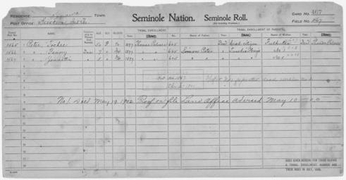 | Keywords: Enrollment for Seminole Census Card 467 - NARA - 268041.tif Scope and content Name Fulhutsa Type Parent Sex Female City of Residence tp Name Fanny Peter Type By Blood Age 7 Sex Female Degree Indian Blood 3/4 Roll Number 1566 City of Residence tp Name Jennatti Peter Type By Blood Age 5 Sex Female Degree Indian Blood 3/4 Roll Number 1567 City of Residence tp Name Simon Peter Type Parent Sex Male City of Residence th Name Tochee Peter Type By Blood Age 50 Sex Female Degree Indian Blood 1/2 Roll Number 1565 City of Residence tp General notes 268041 Local identifier 75-53A-SEMINOLE 467 Department of the Interior Office of Indian Affairs Office of the Commissioner to the Five Civilized Tribes 1893 - 1914 NARA's Southwest Region Fort Worth NRFA 1400 John Burgess Drive Fort Worth TX 76140 Record group Record Group 75 Records of the Bureau of Indian Affairs 1793 - 1999 Record group ARC 404 Enrollment Cards compiled 1898 - 1914 Series ARC 251747 File unit File unit ARC Variant control numbers NAIL Control Number NRFF-75-53A-32705<br /> NAIL Control Number NRFF-75-53A-44013<br /> NAIL Control Number NRFF-75-53A-44014<br /> NAIL Control Number NRFF-75-53A-44033<br /> NAIL Control Number NRFF-75-53A-44035<br /> NAIL Control Number NRFF-75-53A-SEMINOLE 467 yes Other versions <gallery> File Enrollment_for_Seminole_Census_Card_467_-_NARA_-_268041 tif tif File Enrollment_for_Seminole_Census_Card_467_-_NARA_-_268041 jpg jpg </gallery> NARA-cooperation PD-USGov Seminole census cards NARA TIF images with categorized JPGs |