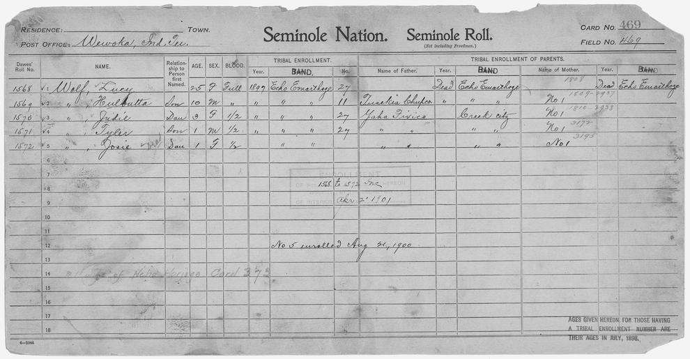 | Keywords: Enrollment for Seminole Census Card 469 - NARA - 268043.tif Scope and content Name Tusekia Chupco Type Parent Sex Male City of Residence ee Name Yaha Fixico Type Parent Sex Male City of Residence Creek Name Hulbutta Wolf Type By Blood Age 10 Sex Male Degree Indian Blood Full Roll Number 1569 City of Residence ee Name Josie Wolf Type By Blood Age 1 Sex Female Degree Indian Blood 1/2 Roll Number 1572 City of Residence ee Name Judie Wolf Type By Blood Age 3 Sex Female Degree Indian Blood 1/2 Roll Number 1570 City of Residence ee Name Lucy Wolf Type By Blood Age 25 Sex Female Degree Indian Blood Full Roll Number 1568 City of Residence ee Name Tyler Wolf Type By Blood Age 1 Sex Male Degree Indian Blood 1/2 Roll Number 1571 City of Residence ee General notes 268043 Local identifier 75-53A-SEMINOLE 469 Department of the Interior Office of Indian Affairs Office of the Commissioner to the Five Civilized Tribes 1893 - 1914 NARA's Southwest Region Fort Worth NRFA 1400 John Burgess Drive Fort Worth TX 76140 Record group Record Group 75 Records of the Bureau of Indian Affairs 1793 - 1999 Record group ARC 404 Enrollment Cards compiled 1898 - 1914 Series ARC 251747 File unit File unit ARC Variant control numbers NAIL Control Number NRFF-75-53A-28164<br /> NAIL Control Number NRFF-75-53A-32141<br /> NAIL Control Number NRFF-75-53A-51836<br /> NAIL Control Number NRFF-75-53A-51857<br /> NAIL Control Number NRFF-75-53A-51858<br /> NAIL Control Number NRFF-75-53A-51868<br /> NAIL Control Number NRFF-75-53A-51903<br /> NAIL Control Number NRFF-75-53A-SEMINOLE 469 yes Other versions <gallery> File Enrollment_for_Seminole_Census_Card_469_-_NARA_-_268043 tif tif File Enrollment_for_Seminole_Census_Card_469_-_NARA_-_268043 jpg jpg </gallery> NARA-cooperation PD-USGov Seminole census cards NARA TIF images with categorized JPGs |