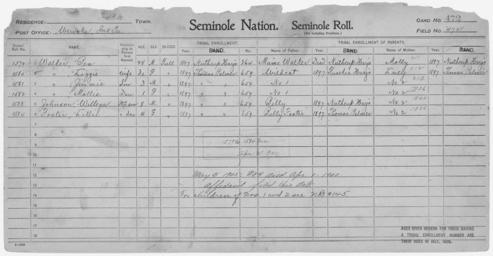 | Keywords: Enrollment for Seminole Census Card 472 - NARA - 268046.tif Scope and content Name Billy Type Parent Sex Male City of Residence nh Name Billy Foster Type Parent Sex Male City of Residence tp Name Lillie Foster Type By Blood Age 4 Sex Female Degree Indian Blood Full Roll Number 1584 City of Residence tp Name Willeya Johnson Type By Blood Age 8 Sex Male Degree Indian Blood Full Roll Number 1583 City of Residence tp Name Lucy Type Parent Sex Female City of Residence tp Name Molly Type Parent Sex Female City of Residence nh Name Ben Walker Type By Blood Age 28 Sex Male Degree Indian Blood Full Roll Number 1579 City of Residence nh Name Jimmie Walker Type By Blood Age 3 Sex Male Degree Indian Blood Full Roll Number 1581 City of Residence tp Name Lizzie Walker Type By Blood Age 30 Sex Female Degree Indian Blood Full Roll Number 1580 City of Residence tp Name Maise Walker Type Parent Sex Male City of Residence nh Name Mollie Walker Type By Blood Age 1 Sex Female Degree Indian Blood Full Roll Number 1582 City of Residence tp Name Wildcat Type Parent Sex Male City of Residence th General notes 268046 Local identifier 75-53A-SEMINOLE 472 Department of the Interior Office of Indian Affairs Office of the Commissioner to the Five Civilized Tribes 1893 - 1914 NARA's Southwest Region Fort Worth NRFA 1400 John Burgess Drive Fort Worth TX 76140 Record group Record Group 75 Records of the Bureau of Indian Affairs 1793 - 1999 Record group ARC 404 Enrollment Cards compiled 1898 - 1914 Series ARC 251747 File unit File unit ARC Variant control numbers NAIL Control Number NRFF-75-53A-25102<br /> NAIL Control Number NRFF-75-53A-32282<br /> NAIL Control Number NRFF-75-53A-32339<br /> NAIL Control Number NRFF-75-53A-37994<br /> NAIL Control Number NRFF-75-53A-40179<br /> NAIL Control Number NRFF-75-53A-42392<br /> NAIL Control Number NRFF-75-53A-50457<br /> NAIL Control Number NRFF-75-53A-50501<br /> NAIL Control Number NRFF-75-53A-50513<br /> NAIL Control Number NRFF-75-53A-50520<br /> NAIL Control Number NRFF-75-53A-50533<br /> NAIL Control Number NRFF-75-53A-51254<br /> NAIL Control Number NRFF-75-53A-SEMINOLE 472 yes Other versions <gallery> File Enrollment_for_Seminole_Census_Card_472_-_NARA_-_268046 tif tif File Enrollment_for_Seminole_Census_Card_472_-_NARA_-_268046 jpg jpg </gallery> NARA-cooperation PD-USGov Seminole census cards NARA TIF images with categorized JPGs |