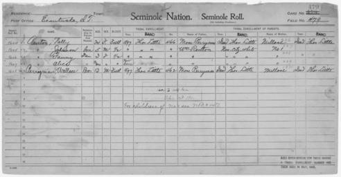 | Keywords: Enrollment for Seminole Census Card 479 - NARA - 268053.jpg Scope and content Name Millose Type Parent Sex Female City of Residence tl Name Mose Perryman Type Parent Sex Male City of Residence tl Name Wallace Perryman Type By Blood Age 13 Sex Male Degree Indian Blood Full Roll Number 1608 City of Residence tl Name Alice Renton Type By Blood Age 1 Sex Female Degree Indian Blood 1/2 Roll Number 1607 City of Residence tl Name Fanny Renton Type By Blood Age 3 Sex Female Degree Indian Blood 1/2 Roll Number 1606 City of Residence tl Name Johnson Renton Type By Blood Age 5 Sex Male Degree Indian Blood 1/2 Roll Number 1605 City of Residence tl Name Nelly Renton Type By Blood Age 24 Sex Female Degree Indian Blood Full Roll Number 1604 City of Residence tl Name William Renton Type Parent Sex Male General notes 268053 Local identifier 75-53A-SEMINOLE 479 Department of the Interior Office of Indian Affairs Office of the Commissioner to the Five Civilized Tribes 1893 - 1914 NARA's Southwest Region Fort Worth NRFA 1400 John Burgess Drive Fort Worth TX 76140 Record group Record Group 75 Records of the Bureau of Indian Affairs 1793 - 1999 Record group ARC 404 Enrollment Cards compiled 1898 - 1914 Series ARC 251747 File unit File unit ARC Variant control numbers NAIL Control Number NRFF-75-53A-42171<br /> NAIL Control Number NRFF-75-53A-43927<br /> NAIL Control Number NRFF-75-53A-43990<br /> NAIL Control Number NRFF-75-53A-44935<br /> NAIL Control Number NRFF-75-53A-44936<br /> NAIL Control Number NRFF-75-53A-44937<br /> NAIL Control Number NRFF-75-53A-44938<br /> NAIL Control Number NRFF-75-53A-44939<br /> NAIL Control Number NRFF-75-53A-SEMINOLE 479 Other versions <gallery> File Enrollment_for_Seminole_Census_Card_479_-_NARA_-_268053 tif tif File Enrollment_for_Seminole_Census_Card_479_-_NARA_-_268053 jpg jpg </gallery> NARA-cooperation PD-USGov Seminole census cards |