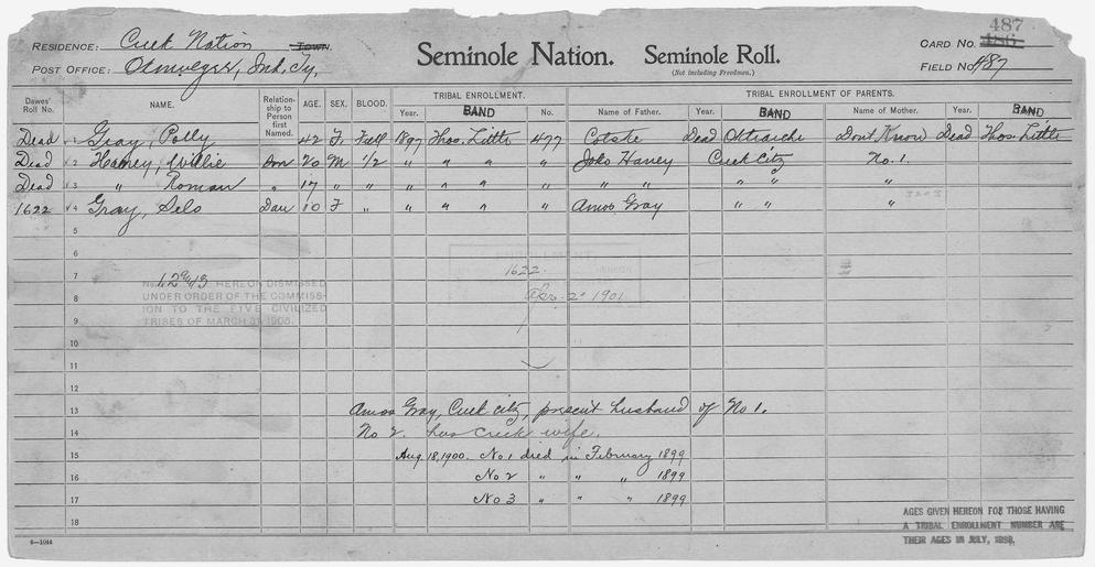 MAKE A MEME View Large Image Enrollment for Seminole Census Card 487 - NARA - 268061.tif Scope and content Name Cotske Type Parent Sex Male City of Residence o Name Amos Gray Type Parent Sex Male City of Residence Creek Name Polly Gray Type By Blood Age 42 Sex Female ...