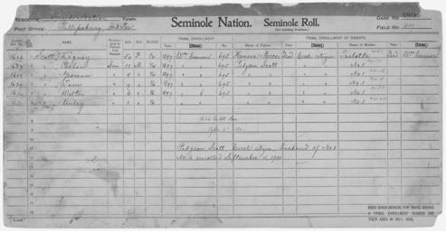 | Keywords: Enrollment for Seminole Census Card 489 - NARA - 268063.tif Scope and content Name Hennea Mecco Type Parent Sex Male City of Residence Creek Name Legusy Scott Type By Blood Age 50 Sex Female Degree Indian Blood 1/2 Roll Number 1626 City of Residence wc Name Phelan Scott Type By Blood Age 11 Sex Male Degree Indian Blood 1/4 Roll Number 1627 City of Residence wc Name Pidgeon Scott Type Parent Sex Male City of Residence Creek Name Tom Scott Type By Blood Age 7 Sex Male Degree Indian Blood 1/4 Roll Number 1629 City of Residence wc Name Walter Scott Type By Blood Age 6 Sex Male Degree Indian Blood 1/4 Roll Number 1630 City of Residence wc Name Wiley Scott Type By Blood Age 1 Sex Male Degree Indian Blood 1/4 Roll Number 1631 City of Residence wc Name Yeoman Scott Type By Blood Age 9 Sex Male Degree Indian Blood 1/4 Roll Number 1628 City of Residence wc Name Tialotke Type Parent Sex Female City of Residence wc General notes 268063 Local identifier 75-53A-SEMINOLE 489 Department of the Interior Office of Indian Affairs Office of the Commissioner to the Five Civilized Tribes 1893 - 1914 NARA's Southwest Region Fort Worth NRFA 1400 John Burgess Drive Fort Worth TX 76140 Record group Record Group 75 Records of the Bureau of Indian Affairs 1793 - 1999 Record group ARC 404 Enrollment Cards compiled 1898 - 1914 Series ARC 251747 File unit File unit ARC Variant control numbers NAIL Control Number NRFF-75-53A-41722<br /> NAIL Control Number NRFF-75-53A-46214<br /> NAIL Control Number NRFF-75-53A-46302<br /> NAIL Control Number NRFF-75-53A-46304<br /> NAIL Control Number NRFF-75-53A-46364<br /> NAIL Control Number NRFF-75-53A-46379<br /> NAIL Control Number NRFF-75-53A-46391<br /> NAIL Control Number NRFF-75-53A-46402<br /> NAIL Control Number NRFF-75-53A-49329<br /> NAIL Control Number NRFF-75-53A-SEMINOLE 489 yes Other versions <gallery> File Enrollment_for_Seminole_Census_Card_489_-_NARA_-_268063 tif tif File Enrollment_for_Seminole_Census_Card_489_-_NARA_-_268063 jpg jpg </gallery> NARA-cooperation PD-USGov Seminole census cards NARA TIF images with categorized JPGs |