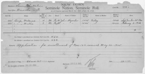 | Keywords: Enrollment for Seminole Census Card 134 - NARA - 267708.tif Scope and content Name Alttiarche Type Parent Sex Male City of Residence o Name Chofullup Harjo Type Parent Sex Male City of Residence ee Name Lisoche Type Parent Sex Female City of Residence oh Name Madelia Type Parent Sex Female City of Residence tp Name Kintah Palmer Type By Blood Age 34 Sex Male Degree Indian Blood Full Roll Number 465 City of Residence tp Name Lowine Palmer Type By Blood Age 25 Sex Female Degree Indian Blood Full Roll Number 466 City of Residence ok Name Susey Type Parent Sex Female City of Residence tp Name Charley Williams Type Parent Sex Male City of Residence Creek Name Joney Williams Type By Blood Age 8 Sex Male Degree Indian Blood 1/2 Roll Number 467 City of Residence tp Name Waldrond Camp Type Newborn Age 4 Sex Male Degree Indian Blood FULL Roll Number 164 Post Office Wewoka Name Willie Camp Type Newborn Age 3 Sex Male Degree Indian Blood FULL Roll Number 165 Post Office Wewoka General notes 267708 Local identifier 75-53A-SEMINOLE 134 Department of the Interior Office of Indian Affairs Office of the Commissioner to the Five Civilized Tribes 1893 - 1914 NARA's Southwest Region Fort Worth NRFA 1400 John Burgess Drive Fort Worth TX 76140 Record group Record Group 75 Records of the Bureau of Indian Affairs 1793 - 1999 Record group ARC 404 Enrollment Cards compiled 1898 - 1914 Series ARC 251747 File unit File unit ARC Variant control numbers NAIL Control Number NRFF-75-53A-23076<br /> NAIL Control Number NRFF-75-53A-34203<br /> NAIL Control Number NRFF-75-53A-39570<br /> NAIL Control Number NRFF-75-53A-40283<br /> NAIL Control Number NRFF-75-53A-43516<br /> NAIL Control Number NRFF-75-53A-43518<br /> NAIL Control Number NRFF-75-53A-48413<br /> NAIL Control Number NRFF-75-53A-51365<br /> NAIL Control Number NRFF-75-53A-51399<br /> NAIL Control Number NRFF-75-53A-52716<br /> NAIL Control Number NRFF-75-53A-52717<br /> NAIL Control Number NRFF-75-53A-SEMINOLE 134 yes Other versions <gallery> File Enrollment_for_Seminole_Census_Card_134_-_NARA_-_267708 tif tif File Enrollment_for_Seminole_Census_Card_134_-_NARA_-_267708 jpg jpg </gallery> NARA-cooperation PD-USGov Cherokee census cards NARA TIF images with categorized JPGs |
