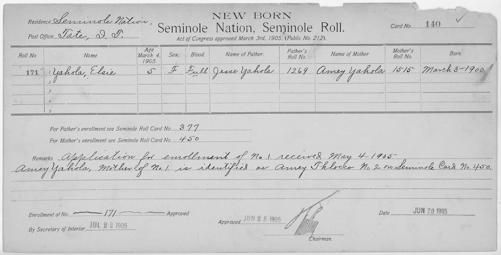 | Keywords: Enrollment for Seminole Census Card 140 - NARA - 267714.tif Scope and content Name Echen Emarthla Type Parent Sex Male City of Residence yh Name John Harjo Type By Blood Age 12 Sex Male Degree Indian Blood Full Roll Number 485 City of Residence tp Name Katy Harjo Type By Blood Age 8 Sex Female Degree Indian Blood Full Roll Number 487 City of Residence tp Name Louisa Harjo Type By Blood Age 5 Sex Female Degree Indian Blood Full Roll Number 488 City of Residence tp Name Lumsey Harjo Type By Blood Age 15 Sex Male Degree Indian Blood Full Roll Number 484 City of Residence tp Name Seluma Harjo Type By Blood Age 18 Sex Male Degree Indian Blood Full Roll Number 483 City of Residence tp Name Totkus Harjo Type By Blood Age 45 Sex Male Degree Indian Blood Full Roll Number 482 City of Residence yh Name Wesley Harjo Type By Blood Age 10 Sex Male Degree Indian Blood Full Roll Number 486 City of Residence tp Name Sehunka Type By Blood Age 20 Sex Male Degree Indian Blood Full Roll Number 489 City of Residence tp Name Winey Type Parent Sex Female City of Residence tp Name Elsie Yahola Type Newborn Age 5 Sex Female Degree Indian Blood FULL Roll Number 171 Post Office Tate General notes 267714 Local identifier 75-53A-SEMINOLE 140 Department of the Interior Office of Indian Affairs Office of the Commissioner to the Five Civilized Tribes 1893 - 1914 NARA's Southwest Region Fort Worth NRFA 1400 John Burgess Drive Fort Worth TX 76140 Record group Record Group 75 Records of the Bureau of Indian Affairs 1793 - 1999 Record group ARC 404 Enrollment Cards compiled 1898 - 1914 Series ARC 251747 File unit File unit ARC Variant control numbers NAIL Control Number NRFF-75-53A-30899<br /> NAIL Control Number NRFF-75-53A-34509<br /> NAIL Control Number NRFF-75-53A-34542<br /> NAIL Control Number NRFF-75-53A-34637<br /> NAIL Control Number NRFF-75-53A-34674<br /> NAIL Control Number NRFF-75-53A-35044<br /> NAIL Control Number NRFF-75-53A-35187<br /> NAIL Control Number NRFF-75-53A-35271<br /> NAIL Control Number NRFF-75-53A-46445<br /> NAIL Control Number NRFF-75-53A-51693<br /> NAIL Control Number NRFF-75-53A-52724<br /> NAIL Control Number NRFF-75-53A-SEMINOLE 140 yes Other versions <gallery> File Enrollment_for_Seminole_Census_Card_140_-_NARA_-_267714 tif tif File Enrollment_for_Seminole_Census_Card_140_-_NARA_-_267714 jpg jpg </gallery> NARA-cooperation PD-USGov Cherokee census cards NARA TIF images with categorized JPGs |