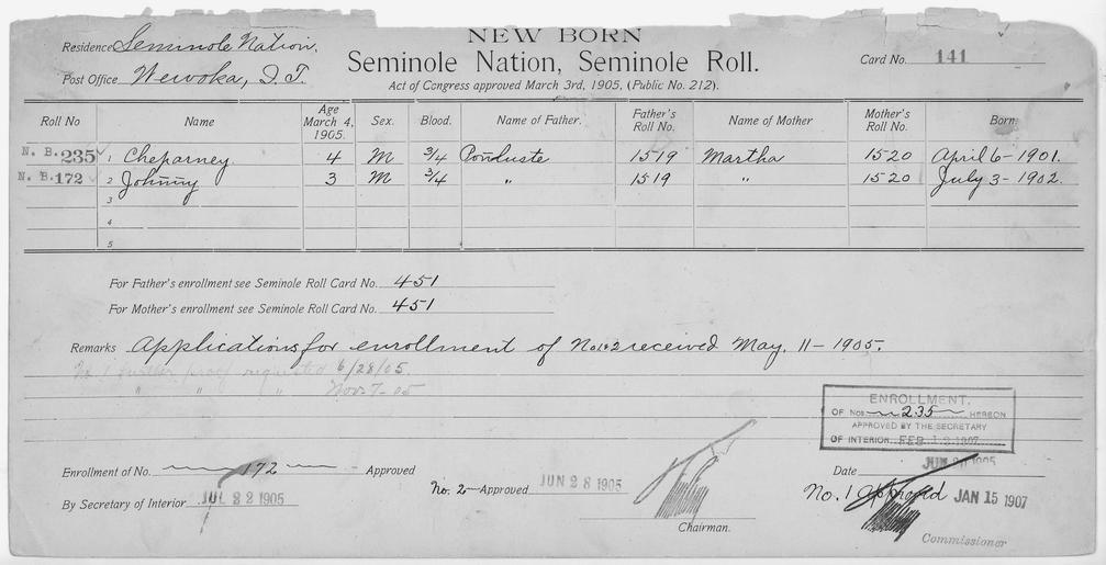 Keywords: Enrollment for Seminole Census Card 141 - NARA - 267715.tif Scope and content Name Ina Chupco Type By Blood Age 5 Sex Female Degree Indian Blood Full Roll Number 493 City of Residence tp Name Lucy Chupco Type By Blood Age 7 Sex Female Degree Indian Blood Full Roll Number 492 City of Residence tp Name Minnie Chupco Type By Blood Age 24 Sex Female Degree Indian Blood Full Roll Number 491 City of Residence tp Name Mollea Chupco Type By Blood Age 1 Sex Female Degree Indian Blood Full City of Residence tp Name Moses Chupco Type By Blood Age 25 Sex Male Degree Indian Blood Full Roll Number 490 City of Residence yh Name Nokus Harjo Type Parent Sex Male City of Residence th Name Hepsey Type Parent Sex Female City of Residence yh Name Miccuche Type Parent Sex Male City of Residence th Name Sarah Type Parent Sex Female City of Residence tp Name Cheparney Type Newborn Age 4 Sex Male Degree Indian Blood 3/4 Roll Number 235 Post Office Wewoka Name Johnny Type Newborn Age 3 Sex Male Degree Indian Blood 3/4 Roll Number 172 Post Office Wewoka General notes 267715 Local identifier 75-53A-SEMINOLE 141 Department of the Interior Office of Indian Affairs Office of the Commissioner to the Five Civilized Tribes 1893 - 1914 NARA's Southwest Region Fort Worth NRFA 1400 John Burgess Drive Fort Worth TX 76140 Record group Record Group 75 Records of the Bureau of Indian Affairs 1793 - 1999 Record group ARC 404 Enrollment Cards compiled 1898 - 1914 Series ARC 251747 File unit File unit ARC Variant control numbers NAIL Control Number NRFF-75-53A-28082<br /> NAIL Control Number NRFF-75-53A-28110<br /> NAIL Control Number NRFF-75-53A-28127<br /> NAIL Control Number NRFF-75-53A-28130<br /> NAIL Control Number NRFF-75-53A-28134<br /> NAIL Control Number NRFF-75-53A-34868<br /> NAIL Control Number NRFF-75-53A-36114<br /> NAIL Control Number NRFF-75-53A-41963<br /> NAIL Control Number NRFF-75-53A-45902<br /> NAIL Control Number NRFF-75-53A-52725<br /> NAIL Control Number NRFF-75-53A-52726<br /> NAIL Control Number NRFF-75-53A-SEMINOLE 141 yes Other versions <gallery> File Enrollment_for_Seminole_Census_Card_141_-_NARA_-_267715 tif tif File Enrollment_for_Seminole_Census_Card_141_-_NARA_-_267715 jpg jpg </gallery> NARA-cooperation PD-USGov Cherokee census cards NARA TIF images with categorized JPGs |