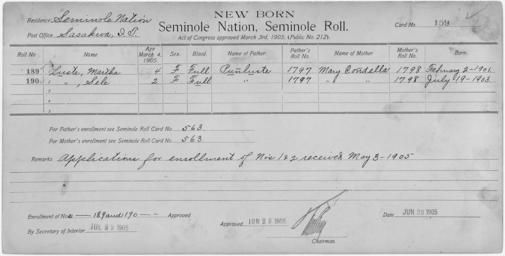 | Keywords: Enrollment for Seminole Census Card 159 - NARA - 267733.tif Scope and content Name Capiche Type Parent Sex Male City of Residence Creek Name Louis Coker Type Parent Sex Male City of Residence Creek Name Eufaula Type Parent Sex Male City of Residence tp Name Jannati Type By Blood Age 10 Sex Female Degree Indian Blood 3/4 Roll Number 556 City of Residence tp Name Rhoda Natukse Type By Blood Age 28 Sex Female Degree Indian Blood 1/2 Roll Number 555 City of Residence tp Name Sukey Natukse Type By Blood Age 45 Sex Female Degree Indian Blood AW Roll Number 554 City of Residence tp Name Notshpyer Type Parent Sex Female City of Residence Creek Name Lucy Reed Type By Blood Age 1 Sex Female Degree Indian Blood 1/2 Roll Number 558 City of Residence tp Name Walter Reed Type Parent Sex Male City of Residence Creek Name Rosana Type By Blood Age 5 Sex Female Degree Indian Blood 1/4 Roll Number 557 City of Residence tp Name Martha Luste Type Newborn Age 4 Sex Female Degree Indian Blood FULL Roll Number 189 Post Office Sasakwa Name Sele Luste Type Newborn Age 2 Sex Female Degree Indian Blood FULL Roll Number 190 Post Office Sasakwa General notes 267733 Local identifier 75-53A-SEMINOLE 159 Department of the Interior Office of Indian Affairs Office of the Commissioner to the Five Civilized Tribes 1893 - 1914 NARA's Southwest Region Fort Worth NRFA 1400 John Burgess Drive Fort Worth TX 76140 Record group Record Group 75 Records of the Bureau of Indian Affairs 1793 - 1999 Record group ARC 404 Enrollment Cards compiled 1898 - 1914 Series ARC 251747 File unit File unit ARC Variant control numbers NAIL Control Number NRFF-75-53A-27100<br /> NAIL Control Number NRFF-75-53A-28477<br /> NAIL Control Number NRFF-75-53A-31099<br /> NAIL Control Number NRFF-75-53A-37471<br /> NAIL Control Number NRFF-75-53A-43002<br /> NAIL Control Number NRFF-75-53A-43003<br /> NAIL Control Number NRFF-75-53A-43319<br /> NAIL Control Number NRFF-75-53A-44903<br /> NAIL Control Number NRFF-75-53A-44919<br /> NAIL Control Number NRFF-75-53A-45420<br /> NAIL Control Number NRFF-75-53A-52756<br /> NAIL Control Number NRFF-75-53A-52757<br /> NAIL Control Number NRFF-75-53A-SEMINOLE 159 yes Other versions <gallery> File Enrollment_for_Seminole_Census_Card_159_-_NARA_-_267733 tif tif File Enrollment_for_Seminole_Census_Card_159_-_NARA_-_267733 jpg jpg </gallery> NARA-cooperation PD-USGov Cherokee census cards NARA TIF images with categorized JPGs |