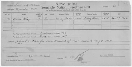 | Keywords: Enrollment for Seminole Census Card 61 - NARA - 267635.tif Scope and content Name Elly Conner Type By Blood Age 6 Sex Female Degree Indian Blood 1/2 Roll Number 224 City of Residence wc Name Lizzie Conner Type By Blood Age 2 Sex Female Degree Indian Blood 1/2 Roll Number 225 City of Residence wc Name William Conner Type Parent Sex Male City of Residence wc Name Wynie Conner Type By Blood Age 21 Sex Female Degree Indian Blood Full Roll Number 223 City of Residence wc Name Judie Type Parent Sex Female City of Residence k Name Patsy Davis Type Newborn Freedmen-Rejected Age 3 Sex Female Degree Indian Blood Not Reported Roll Number 67 Post Office Wewoka General notes 267635 Local identifier 75-53A-SEMINOLE 61 Department of the Interior Office of Indian Affairs Office of the Commissioner to the Five Civilized Tribes 1893 - 1914 NARA's Southwest Region Fort Worth NRFA 1400 John Burgess Drive Fort Worth TX 76140 Record group Record Group 75 Records of the Bureau of Indian Affairs 1793 - 1999 Record group ARC 404 Enrollment Cards compiled 1898 - 1914 Series ARC 251747 File unit File unit ARC Variant control numbers NAIL Control Number NRFF-75-53A-28693<br /> NAIL Control Number NRFF-75-53A-28698<br /> NAIL Control Number NRFF-75-53A-28711<br /> NAIL Control Number NRFF-75-53A-28713<br /> NAIL Control Number NRFF-75-53A-38191<br /> NAIL Control Number NRFF-75-53A-52897<br /> NAIL Control Number NRFF-75-53A-SEMINOLE 61 yes Other versions <gallery> File Enrollment_for_Seminole_Census_Card_61_-_NARA_-_267635 tif tif File Enrollment_for_Seminole_Census_Card_61_-_NARA_-_267635 jpg jpg </gallery> NARA-cooperation PD-USGov Cherokee census cards Seminole census cards NARA TIF images with categorized JPGs |