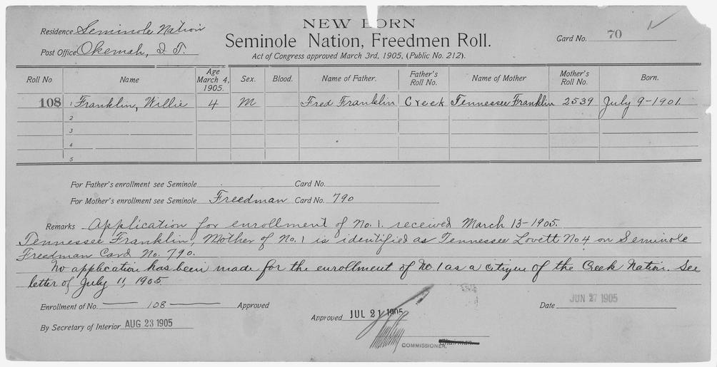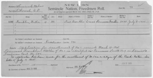 | Keywords: Enrollment for Seminole Census Card 70 - NARA - 267644.tif Scope and content Name Bessie Factor Type By Blood Age 20 Sex Female Degree Indian Blood Full Roll Number 256 City of Residence yh Name Edward Factor Type By Blood Age 1 Sex Male Degree Indian Blood Full Roll Number 257 City of Residence yh Name Marchey Factor Type By Blood Age 23 Sex Male Degree Indian Blood Full Roll Number 255 City of Residence tp Name Thomas Factor Type Parent Sex Male City of Residence tp Name Totkus Harjo Type Parent Sex Male City of Residence yh Name Willie Franklin Type Newborn Freedmen-Rejected Age 4 Sex Male Degree Indian Blood Not Reported Roll Number 108 Post Office Okemah General notes 267644 Local identifier 75-53A-SEMINOLE 70 Department of the Interior Office of Indian Affairs Office of the Commissioner to the Five Civilized Tribes 1893 - 1914 NARA's Southwest Region Fort Worth NRFA 1400 John Burgess Drive Fort Worth TX 76140 Record group Record Group 75 Records of the Bureau of Indian Affairs 1793 - 1999 Record group ARC 404 Enrollment Cards compiled 1898 - 1914 Series ARC 251747 File unit File unit ARC Variant control numbers NAIL Control Number NRFF-75-53A-31167<br /> NAIL Control Number NRFF-75-53A-31177<br /> NAIL Control Number NRFF-75-53A-31235<br /> NAIL Control Number NRFF-75-53A-31264<br /> NAIL Control Number NRFF-75-53A-35185<br /> NAIL Control Number NRFF-75-53A-52909<br /> NAIL Control Number NRFF-75-53A-SEMINOLE 70 yes Other versions <gallery> File Enrollment_for_Seminole_Census_Card_70_-_NARA_-_267644 tif tif File Enrollment_for_Seminole_Census_Card_70_-_NARA_-_267644 jpg jpg </gallery> NARA-cooperation PD-USGov Cherokee census cards Seminole census cards NARA TIF images with categorized JPGs |