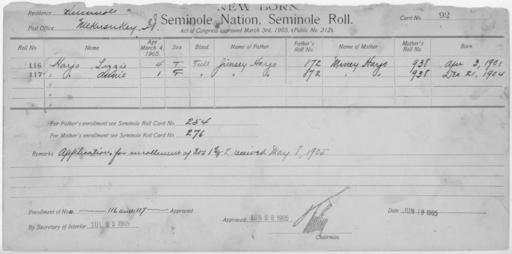 | Keywords: Enrollment for Seminole Census Card 92 - NARA - 267666.jpg Scope and content Name Charlie Emarther Type Parent Sex Male City of Residence yh Name Artus Harjo Type By Blood Age 65 Sex Male Degree Indian Blood Full City of Residence th Name Ishitchee Harjo Type By Blood Age 45 Sex Female Degree Indian Blood Full Roll Number 319 City of Residence th Name Lina Harjo Type By Blood Age 18 Sex Female Degree Indian Blood Full Roll Number 320 City of Residence th Name Billy Mingo Type By Blood Age 10 Sex Male Degree Indian Blood Full Roll Number 321 City of Residence th Name Jennie Mingo Type By Blood Age 17 Sex Female Degree Indian Blood Full Roll Number 322 City of Residence th Name Lizzie Harjo Type Newborn Age 4 Sex Female Degree Indian Blood FULL Roll Number 116 Post Office Mekusukey Name Annie Harjo Type Newborn Age 1 Sex Female Degree Indian Blood FULL Roll Number 117 Post Office Mekusukey Name Dollie Doser Type Newborn Freedmen-Rejected Age 2 Sex Female Degree Indian Blood Not Reported Roll Number 129 Post Office Mikuaukey General notes 267666 Local identifier 75-53A-SEMINOLE 92 Department of the Interior Office of Indian Affairs Office of the Commissioner to the Five Civilized Tribes 1893 - 1914 NARA's Southwest Region Fort Worth NRFA 1400 John Burgess Drive Fort Worth TX 76140 Record group Record Group 75 Records of the Bureau of Indian Affairs 1793 - 1999 Record group ARC 404 Enrollment Cards compiled 1898 - 1914 Series ARC 251747 File unit File unit ARC Variant control numbers NAIL Control Number NRFF-75-53A-30874<br /> NAIL Control Number NRFF-75-53A-34105<br /> NAIL Control Number NRFF-75-53A-34439<br /> NAIL Control Number NRFF-75-53A-34598<br /> NAIL Control Number NRFF-75-53A-42207<br /> NAIL Control Number NRFF-75-53A-42211<br /> NAIL Control Number NRFF-75-53A-52654<br /> NAIL Control Number NRFF-75-53A-52655<br /> NAIL Control Number NRFF-75-53A-52940<br /> NAIL Control Number NRFF-75-53A-SEMINOLE 92 Other versions <gallery> File Enrollment_for_Seminole_Census_Card_92_-_NARA_-_267666 tif tif File Enrollment_for_Seminole_Census_Card_92_-_NARA_-_267666 jpg jpg </gallery> NARA-cooperation PD-USGov Cherokee census cards |
