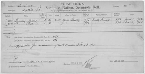 | Keywords: Enrollment for Seminole Census Card 96 - NARA - 267670.jpg Scope and content Name Chimkah Catcher Type By Blood Age 45 Sex Female Degree Indian Blood Full Roll Number 334 City of Residence tp Name Louis Catcher Type By Blood Age 45 Sex Male Degree Indian Blood Full Roll Number 333 City of Residence tp Name Ina Gibson Type By Blood Age 6 Sex Female Degree Indian Blood Full Roll Number 337 City of Residence th Name Hoguddie Type Parent Sex Female City of Residence tp Name Benny Jefferson Type By Blood Age 13 Sex Male Degree Indian Blood Full Roll Number 336 City of Residence tp Name Sarah Jefferson Type By Blood Age 17 Sex Female Degree Indian Blood Full Roll Number 335 City of Residence tp Name Thomas Jefferson Type Parent Sex Male City of Residence th Name Konaka Type Parent Sex Male City of Residence tp Name James Larney Type Newborn Age 3 Sex Male Degree Indian Blood FULL Roll Number 119 Post Office Little Name Bunnie Larney Type Newborn Age 1 Sex Male Degree Indian Blood FULL Roll Number 120 Post Office Little General notes 267670 Local identifier 75-53A-SEMINOLE 96 Department of the Interior Office of Indian Affairs Office of the Commissioner to the Five Civilized Tribes 1893 - 1914 NARA's Southwest Region Fort Worth NRFA 1400 John Burgess Drive Fort Worth TX 76140 Record group Record Group 75 Records of the Bureau of Indian Affairs 1793 - 1999 Record group ARC 404 Enrollment Cards compiled 1898 - 1914 Series ARC 251747 File unit File unit ARC Variant control numbers NAIL Control Number NRFF-75-53A-27369<br /> NAIL Control Number NRFF-75-53A-27371<br /> NAIL Control Number NRFF-75-53A-32906<br /> NAIL Control Number NRFF-75-53A-36474<br /> NAIL Control Number NRFF-75-53A-37479<br /> NAIL Control Number NRFF-75-53A-37501<br /> NAIL Control Number NRFF-75-53A-37514<br /> NAIL Control Number NRFF-75-53A-38894<br /> NAIL Control Number NRFF-75-53A-52661<br /> NAIL Control Number NRFF-75-53A-52662<br /> NAIL Control Number NRFF-75-53A-SEMINOLE 96 Other versions <gallery> File Enrollment_for_Seminole_Census_Card_96_-_NARA_-_267670 tif tif File Enrollment_for_Seminole_Census_Card_96_-_NARA_-_267670 jpg jpg </gallery> NARA-cooperation PD-USGov Cherokee census cards |