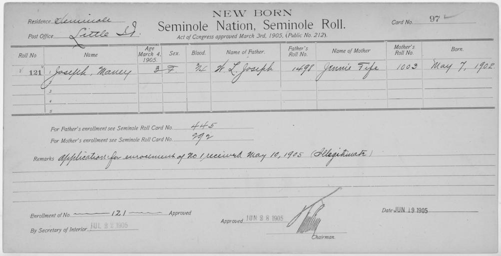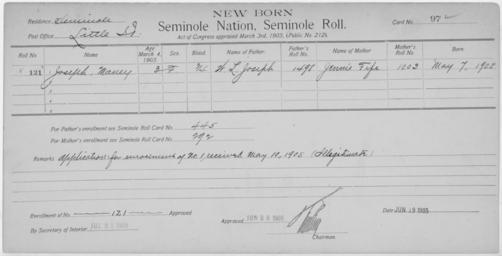 | Keywords: Enrollment for Seminole Census Card 97 - NARA - 267671.jpg Scope and content Name Hoktoke Type By Blood Age 14 Sex Female Degree Indian Blood Full Roll Number 341 City of Residence tp Name Itchkanaaha Type Parent Sex Female City of Residence tp Name Jannie Type By Blood Age 55 Sex Female Degree Indian Blood Full Roll Number 339 City of Residence o Name Josey Type By Blood Age 8 Sex Male Degree Indian Blood Full Roll Number 342 City of Residence tp Name Ponnokee Type By Blood Age 45 Sex Male Degree Indian Blood Full Roll Number 338 City of Residence th Name Sefah Type By Blood Age 18 Sex Male Degree Indian Blood Full Roll Number 340 City of Residence tp Name Maney Joseph Type Newborn Age 3 Sex Female Degree Indian Blood 3/4 Roll Number 121 Post Office Little General notes 267671 Local identifier 75-53A-SEMINOLE 97 Department of the Interior Office of Indian Affairs Office of the Commissioner to the Five Civilized Tribes 1893 - 1914 NARA's Southwest Region Fort Worth NRFA 1400 John Burgess Drive Fort Worth TX 76140 Record group Record Group 75 Records of the Bureau of Indian Affairs 1793 - 1999 Record group ARC 404 Enrollment Cards compiled 1898 - 1914 Series ARC 251747 File unit File unit ARC Variant control numbers NAIL Control Number NRFF-75-53A-36520<br /> NAIL Control Number NRFF-75-53A-37219<br /> NAIL Control Number NRFF-75-53A-37472<br /> NAIL Control Number NRFF-75-53A-38180<br /> NAIL Control Number NRFF-75-53A-44358<br /> NAIL Control Number NRFF-75-53A-46434<br /> NAIL Control Number NRFF-75-53A-52663<br /> NAIL Control Number NRFF-75-53A-SEMINOLE 97 Other versions <gallery> File Enrollment_for_Seminole_Census_Card_97_-_NARA_-_267671 tif tif File Enrollment_for_Seminole_Census_Card_97_-_NARA_-_267671 jpg jpg </gallery> NARA-cooperation PD-USGov Cherokee census cards |