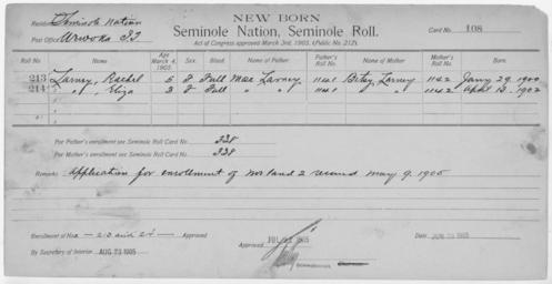 | Keywords: Enrollment for Seminole Census Card 108 - NARA - 267682.jpg Scope and content Name Dinah Type By Blood Age 14 Sex Female Degree Indian Blood Full Roll Number 380 City of Residence yh Name Charlie Harjo Type Parent Sex Male City of Residence tl Name Meka Harjo Type Parent Sex Male City of Residence th Name Mitchile Type By Blood Age 47 Sex Male Degree Indian Blood Full Roll Number 377 City of Residence th Name Sakteke Type By Blood Age 35 Sex Female Degree Indian Blood Full Roll Number 378 City of Residence yh Name Samuel Type By Blood Age 1 Sex Male Degree Indian Blood Full Roll Number 382 City of Residence yh Name Tusechokte Type Parent Sex Female City of Residence yh Name Webster Type By Blood Age 10 Sex Male Degree Indian Blood Full Roll Number 381 City of Residence yh Name Willie Type By Blood Age 17 Sex Male Degree Indian Blood Full Roll Number 379 City of Residence yh Name Rachel Larney Type Newborn Age 5 Sex Female Degree Indian Blood FULL Roll Number 213 Post Office Wewoka Name Eliza Larney Type Newborn Age 3 Sex Female Degree Indian Blood FULL Roll Number 214 Post Office Wewoka General notes 267682 Local identifier 75-53A-SEMINOLE 108 Department of the Interior Office of Indian Affairs Office of the Commissioner to the Five Civilized Tribes 1893 - 1914 NARA's Southwest Region Fort Worth NRFA 1400 John Burgess Drive Fort Worth TX 76140 Record group Record Group 75 Records of the Bureau of Indian Affairs 1793 - 1999 Record group ARC 404 Enrollment Cards compiled 1898 - 1914 Series ARC 251747 File unit File unit ARC Variant control numbers NAIL Control Number NRFF-75-53A-30428<br /> NAIL Control Number NRFF-75-53A-34160<br /> NAIL Control Number NRFF-75-53A-34725<br /> NAIL Control Number NRFF-75-53A-42345<br /> NAIL Control Number NRFF-75-53A-45573<br /> NAIL Control Number NRFF-75-53A-45714<br /> NAIL Control Number NRFF-75-53A-50195<br /> NAIL Control Number NRFF-75-53A-50928<br /> NAIL Control Number NRFF-75-53A-51462<br /> NAIL Control Number NRFF-75-53A-52678<br /> NAIL Control Number NRFF-75-53A-52679<br /> NAIL Control Number NRFF-75-53A-SEMINOLE 108 Other versions <gallery> File Enrollment_for_Seminole_Census_Card_108_-_NARA_-_267682 tif tif File Enrollment_for_Seminole_Census_Card_108_-_NARA_-_267682 jpg jpg </gallery> NARA-cooperation PD-USGov Cherokee census cards |