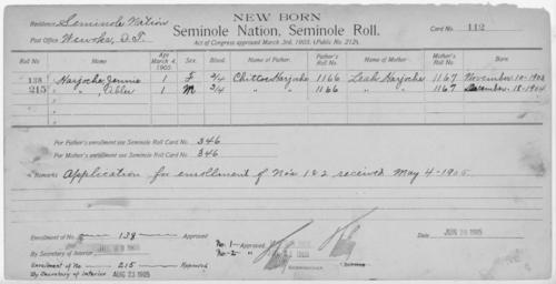 | Keywords: Enrollment for Seminole Census Card 112 - NARA - 267686.jpg Scope and content Name Cowake Type By Blood Age 55 Sex Male Degree Indian Blood Full Roll Number 387 City of Residence k Name Martey Type Parent Sex Male City of Residence nh Name Octemehe Type Parent Sex Female City of Residence th Name Okfuska Type Parent Sex Male City of Residence yh Name Rhoda Type Parent Sex Female City of Residence sb Name Robert Type By Blood Age 18 Sex Male Degree Indian Blood Full Roll Number 389 City of Residence ee Name Simedihakee Type By Blood Age 33 Sex Female Degree Indian Blood Full Roll Number 388 City of Residence th Name Jennie Harjoche Type Newborn Age 1 Sex Female Degree Indian Blood 3/4 Roll Number 138 Post Office Wewoka Name Abler Harjoche Type Newborn Age 1 Sex Male Degree Indian Blood 3/4 Roll Number 215 Post Office Wewoka General notes 267686 Local identifier 75-53A-SEMINOLE 112 Department of the Interior Office of Indian Affairs Office of the Commissioner to the Five Civilized Tribes 1893 - 1914 NARA's Southwest Region Fort Worth NRFA 1400 John Burgess Drive Fort Worth TX 76140 Record group Record Group 75 Records of the Bureau of Indian Affairs 1793 - 1999 Record group ARC 404 Enrollment Cards compiled 1898 - 1914 Series ARC 251747 File unit File unit ARC Variant control numbers NAIL Control Number NRFF-75-53A-28986<br /> NAIL Control Number NRFF-75-53A-40718<br /> NAIL Control Number NRFF-75-53A-43360<br /> NAIL Control Number NRFF-75-53A-43379<br /> NAIL Control Number NRFF-75-53A-44990<br /> NAIL Control Number NRFF-75-53A-45179<br /> NAIL Control Number NRFF-75-53A-46856<br /> NAIL Control Number NRFF-75-53A-52685<br /> NAIL Control Number NRFF-75-53A-52686<br /> NAIL Control Number NRFF-75-53A-SEMINOLE 112 Other versions <gallery> File Enrollment_for_Seminole_Census_Card_112_-_NARA_-_267686 tif tif File Enrollment_for_Seminole_Census_Card_112_-_NARA_-_267686 jpg jpg </gallery> NARA-cooperation PD-USGov Cherokee census cards |