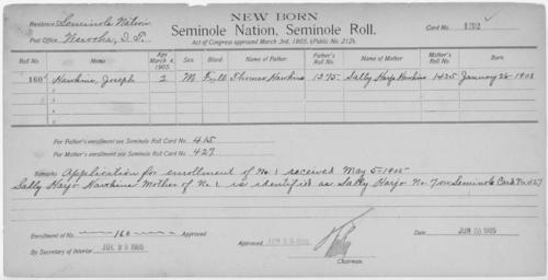 | Keywords: Enrollment for Seminole Census Card 132 - NARA - 267706.jpg Scope and content Name Rosanna Type Parent Sex Female City of Residence wc Name Foklotka Wilson Type By Blood Age 28 Sex Female Degree Indian Blood Full Roll Number 458 City of Residence th Name John Wilson Type By Blood Age 35 Sex Male Degree Indian Blood Full Roll Number 457 City of Residence wc Name Lucinda Wilson Type By Blood Age 5 Sex Female Degree Indian Blood Full Roll Number 462 City of Residence th Name Melissa Wilson Type By Blood Age 15 Sex Female Degree Indian Blood Full Roll Number 459 City of Residence th Name Mollie Wilson Type By Blood Age 7 Sex Female Degree Indian Blood Full Roll Number 460 City of Residence th Name Munnah Wilson Type By Blood Age 1 Sex Female Degree Indian Blood Full Roll Number 463 City of Residence th Name Sallie Wilson Type By Blood Age 1 Sex Female Degree Indian Blood Full City of Residence th Name Yarner Wilson Type By Blood Age 6 Sex Female Degree Indian Blood Full Roll Number 461 City of Residence th Name Joseph Hawkins Type Newborn Age 2 Sex Male Degree Indian Blood FULL Roll Number 160 Post Office Wewoka General notes 267706 Local identifier 75-53A-SEMINOLE 132 Department of the Interior Office of Indian Affairs Office of the Commissioner to the Five Civilized Tribes 1893 - 1914 NARA's Southwest Region Fort Worth NRFA 1400 John Burgess Drive Fort Worth TX 76140 Record group Record Group 75 Records of the Bureau of Indian Affairs 1793 - 1999 Record group ARC 404 Enrollment Cards compiled 1898 - 1914 Series ARC 251747 File unit File unit ARC Variant control numbers NAIL Control Number NRFF-75-53A-45422<br /> NAIL Control Number NRFF-75-53A-51578<br /> NAIL Control Number NRFF-75-53A-51601<br /> NAIL Control Number NRFF-75-53A-51616<br /> NAIL Control Number NRFF-75-53A-51624<br /> NAIL Control Number NRFF-75-53A-51628<br /> NAIL Control Number NRFF-75-53A-51631<br /> NAIL Control Number NRFF-75-53A-51644<br /> NAIL Control Number NRFF-75-53A-51662<br /> NAIL Control Number NRFF-75-53A-52712<br /> NAIL Control Number NRFF-75-53A-SEMINOLE 132 Other versions <gallery> File Enrollment_for_Seminole_Census_Card_132_-_NARA_-_267706 tif tif File Enrollment_for_Seminole_Census_Card_132_-_NARA_-_267706 jpg jpg </gallery> NARA-cooperation PD-USGov Cherokee census cards |