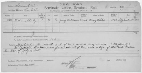| Keywords: Enrollment for Seminole Census Card 135 - NARA - 267709.jpg Scope and content Name Aharlak Harjo Type By Blood Age 38 Sex Male Degree Indian Blood Full Roll Number 468 City of Residence wc Name Cheparney Harjo Type By Blood Age 7 Sex Male Degree Indian Blood Full Roll Number 469 City of Residence th Name Lima Harjo Type By Blood Age 2 Sex Male Degree Indian Blood Full Roll Number 471 City of Residence th Name Mihi Harjo Type Parent Sex Female City of Residence th Name Mollie Harjo Type By Blood Age 4 Sex Female Degree Indian Blood Full Roll Number 470 City of Residence th Name Woxie Harjo Type Parent Sex Male City of Residence wc Name Charley Williams Type Newborn Age 1 Sex Male Degree Indian Blood 1/2 Roll Number 219 Post Office Wewoka General notes 267709 Local identifier 75-53A-SEMINOLE 135 Department of the Interior Office of Indian Affairs Office of the Commissioner to the Five Civilized Tribes 1893 - 1914 NARA's Southwest Region Fort Worth NRFA 1400 John Burgess Drive Fort Worth TX 76140 Record group Record Group 75 Records of the Bureau of Indian Affairs 1793 - 1999 Record group ARC 404 Enrollment Cards compiled 1898 - 1914 Series ARC 251747 File unit File unit ARC Variant control numbers NAIL Control Number NRFF-75-53A-34033<br /> NAIL Control Number NRFF-75-53A-34173<br /> NAIL Control Number NRFF-75-53A-34597<br /> NAIL Control Number NRFF-75-53A-34741<br /> NAIL Control Number NRFF-75-53A-34776<br /> NAIL Control Number NRFF-75-53A-35310<br /> NAIL Control Number NRFF-75-53A-52718<br /> NAIL Control Number NRFF-75-53A-SEMINOLE 135 Other versions <gallery> File Enrollment_for_Seminole_Census_Card_135_-_NARA_-_267709 tif tif File Enrollment_for_Seminole_Census_Card_135_-_NARA_-_267709 jpg jpg </gallery> NARA-cooperation PD-USGov Cherokee census cards |