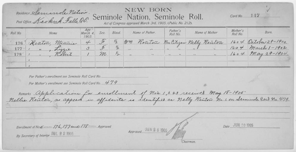 Keywords: Enrollment for Seminole Census Card 147 - NARA - 267721.jpg Scope and content Name Billy Cully Type Parent Sex Male City of Residence th Name Osan Fixico Type Parent Sex Male City of Residence yh Name George Type By Blood Age 15 Sex Male Degree Indian Blood Full Roll Number 512 City of Residence yh Name Susie Type By Blood Age 24 Sex Female Degree Indian Blood Full Roll Number 510 City of Residence yh Name Walter Type By Blood Age 6 Sex Male Degree Indian Blood Full Roll Number 511 City of Residence yh Name Minnie Renton Type Newborn Age 4 Sex Female Degree Indian Blood 1/2 Roll Number 176 Post Office Keokuk Falls Name Lizzie Renton Type Newborn Age 3 Sex Female Degree Indian Blood 1/2 Roll Number 177 Post Office Keokuk Falls Name Robert Renton Type Newborn Age 1 Sex Male Degree Indian Blood 1/2 Roll Number 178 Post Office Keokuk Falls General notes 267721 Local identifier 75-53A-SEMINOLE 147 Department of the Interior Office of Indian Affairs Office of the Commissioner to the Five Civilized Tribes 1893 - 1914 NARA's Southwest Region Fort Worth NRFA 1400 John Burgess Drive Fort Worth TX 76140 Record group Record Group 75 Records of the Bureau of Indian Affairs 1793 - 1999 Record group ARC 404 Enrollment Cards compiled 1898 - 1914 Series ARC 251747 File unit File unit ARC Variant control numbers NAIL Control Number NRFF-75-53A-29323<br /> NAIL Control Number NRFF-75-53A-32034<br /> NAIL Control Number NRFF-75-53A-32866<br /> NAIL Control Number NRFF-75-53A-48428<br /> NAIL Control Number NRFF-75-53A-50577<br /> NAIL Control Number NRFF-75-53A-52734<br /> NAIL Control Number NRFF-75-53A-52735<br /> NAIL Control Number NRFF-75-53A-52736<br /> NAIL Control Number NRFF-75-53A-SEMINOLE 147 Other versions <gallery> File Enrollment_for_Seminole_Census_Card_147_-_NARA_-_267721 tif tif File Enrollment_for_Seminole_Census_Card_147_-_NARA_-_267721 jpg jpg </gallery> NARA-cooperation PD-USGov Cherokee census cards |